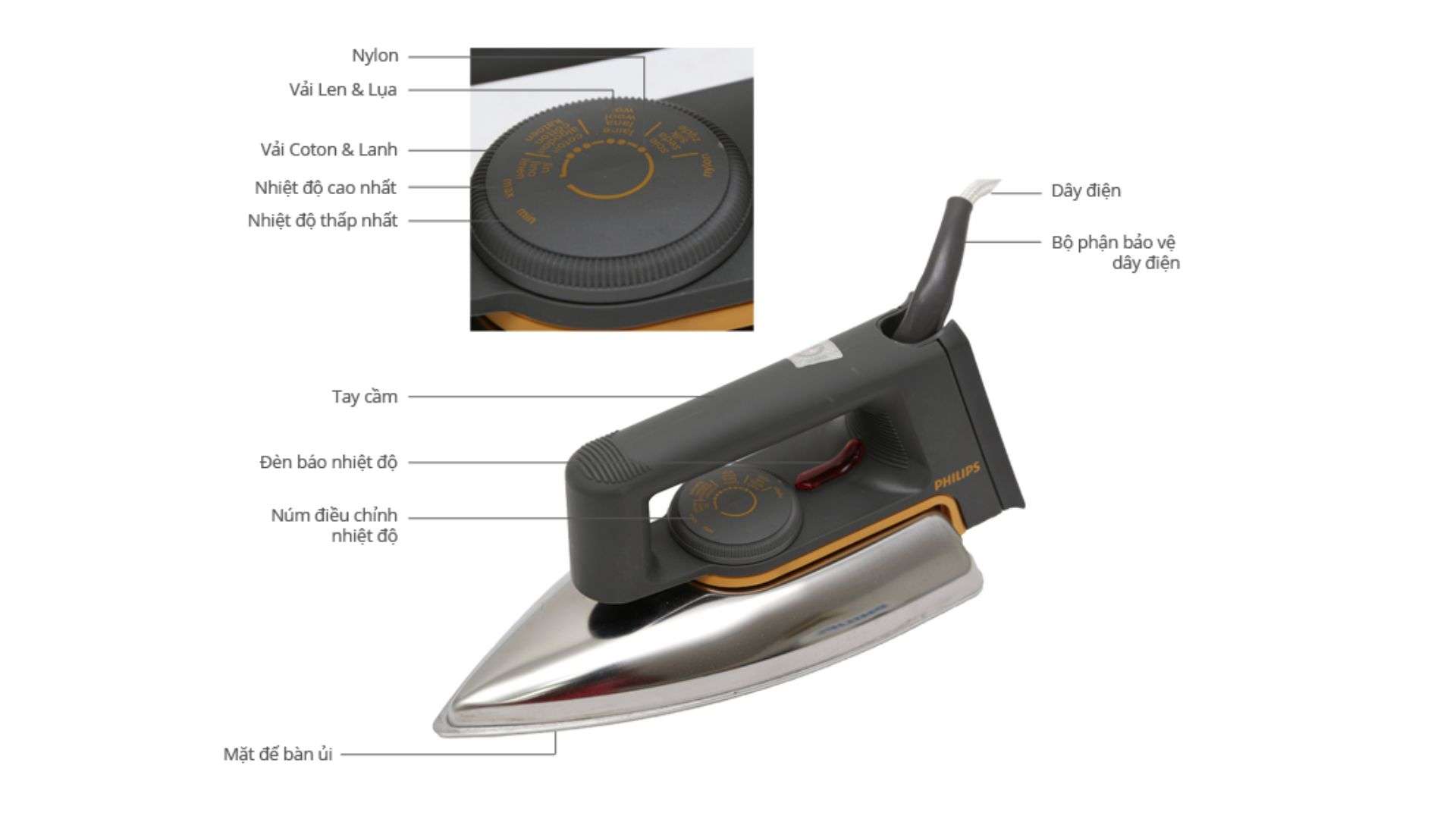 Mặt đế còn có bề mặt chống dính, giúp bàn ủi lướt nhẹ nhàng trên vải, bảo vệ sợi vải không bị tổn hại trong quá trình ủi.