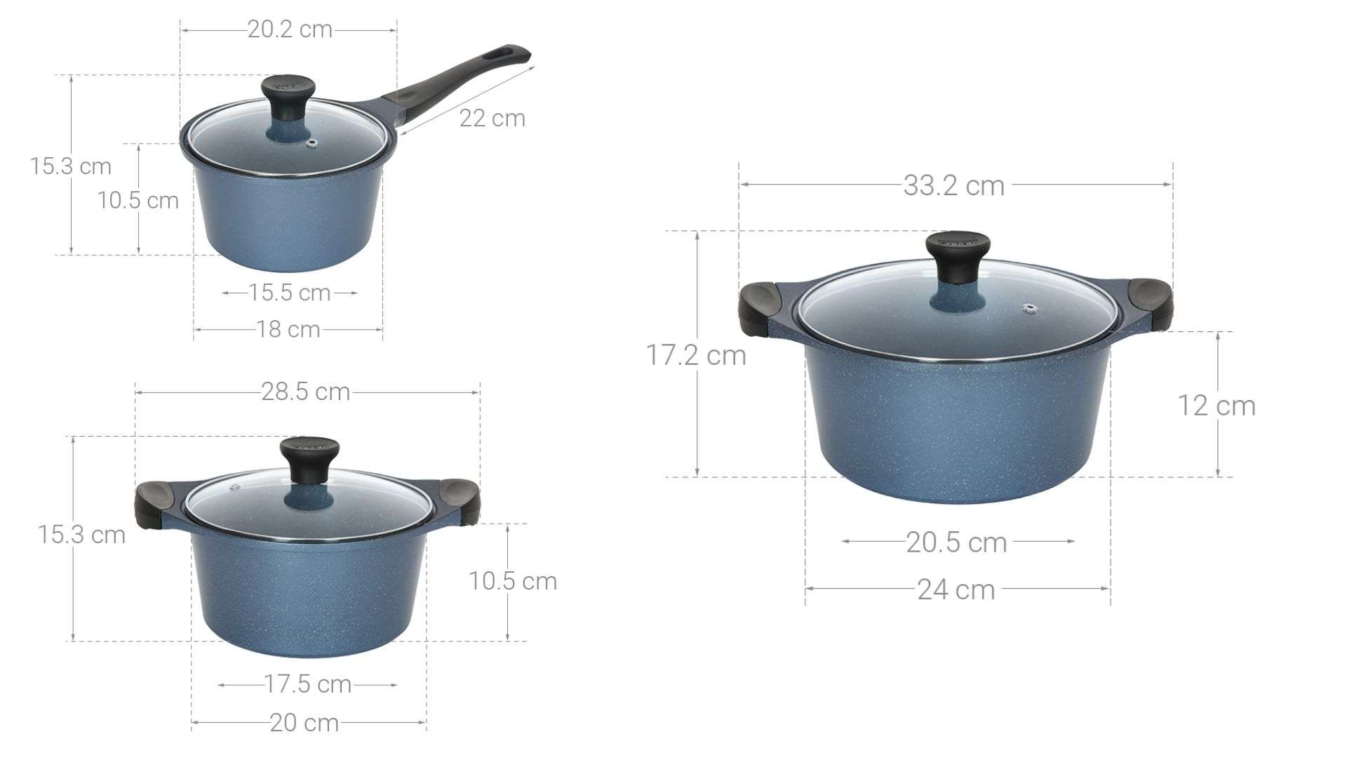 Sản phẩm trong hộp: Quánh có nắp 18 cm, Nồi có nắp 20 cm, Nồi có nắp 24 cm, Sách hướng dẫn sử dụng.