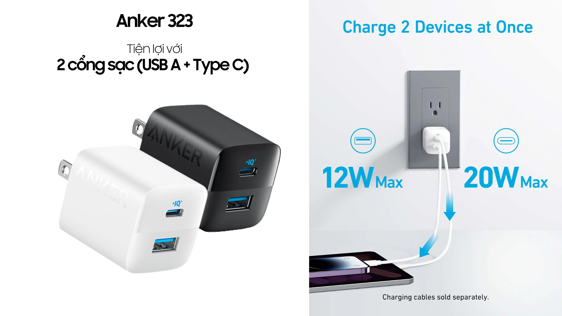 • Củ sạc Anker 323: có 2 cổng USB-C, USB-A, sạc đồng thời hai thiết bị.