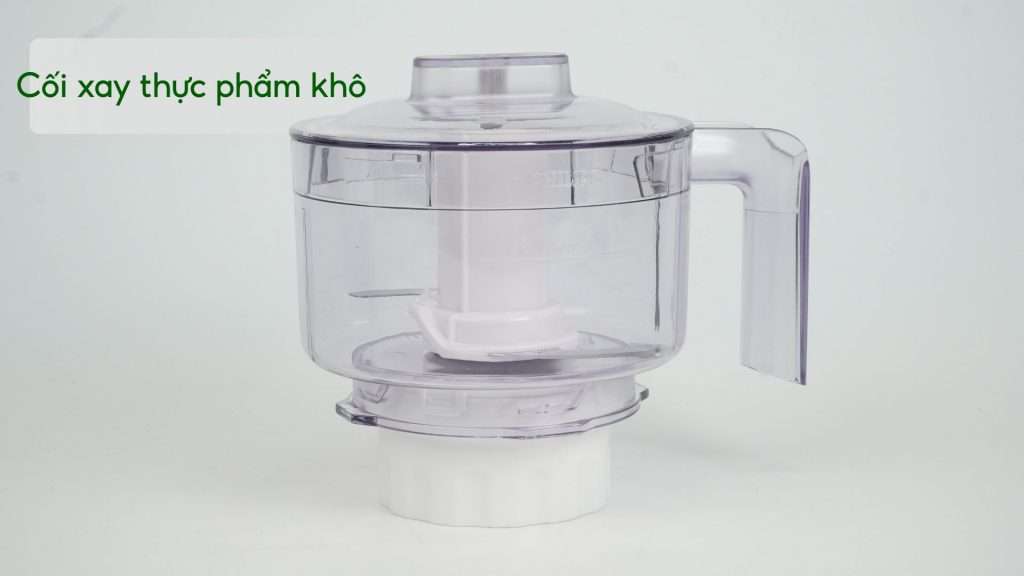 Philips HR2223/00 đi kèm cối lớn 2 lít (dung tích thực 1.5 lít) bằng nhựa kháng vỡ cao cấp, an toàn thực phẩm, phù hợp xay sinh tố, súp, nước ép cho gia đình 3-5 người. Hai cối nhỏ (0.3 lít và 0.5 lít) chuyên xay khô gia vị, hành, tỏi, ớt, hạt cà phê, tiêu, không lẫn mùi. Đũa khuấy hỗ trợ trộn đều nguyên liệu, đảm bảo kết quả xay mịn. Cối nhựa không chứa BPA, bền bỉ, không ám mùi, dễ vệ sinh bằng máy rửa chén. Bộ cối đa năng mang lại sự linh hoạt với xay sinh tố đa dạng, từ món uống đến gia vị.