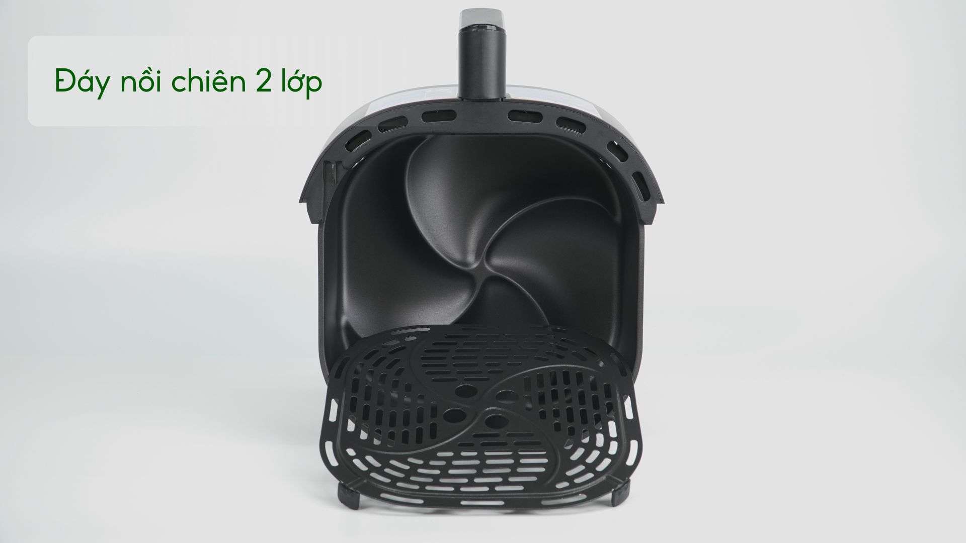 Giỏ chiên dung tích 6.2L (khoảng 1.2kg thực phẩm) hỗ trợ chế biến lượng vừa đủ. Vỉ tách dầu giúp thực phẩm ít dầu hơn, phù hợp cho chế độ ăn kiêng. Các đặc điểm này mang lại nấu ăn an toàn, lý tưởng cho gia đình có trẻ nhỏ.
