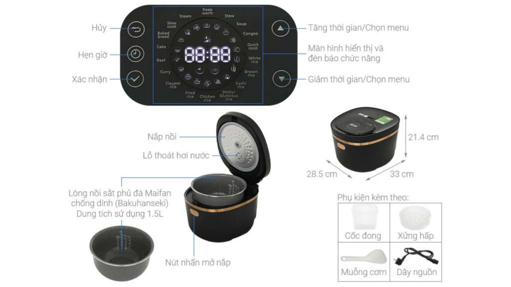 Hẹn giờ 24 tiếng cho phép linh hoạt cài đặt thời gian nấu, phù hợp với người bận rộn. Dung tích 1.8L (khoảng 1kg gạo) hỗ trợ chế biến lượng vừa đủ. Công nghệ IH và xửng hấp đa năng giúp nấu cơm ngon và các món ăn kèm dễ dàng, tiết kiệm công sức. Các đặc điểm này mang lại nấu ăn an toàn, lý tưởng cho gia đình có trẻ nhỏ hoặc người lớn tuổi.