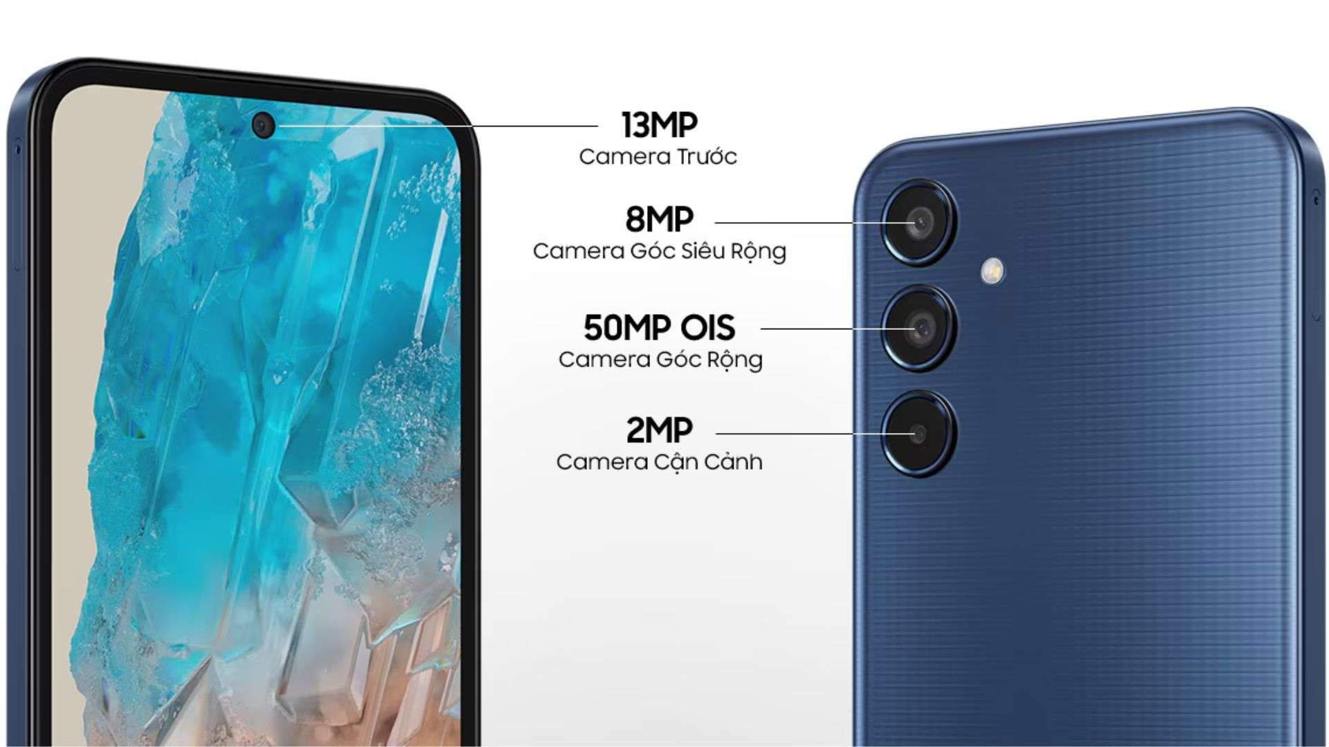 Hệ thống camera của Samsung Galaxy M35 5G 8GB/256GB được thiết kế để ghi lại mọi khoảnh khắc với chất lượng ấn tượng. Camera chính 50MP tích hợp OIS (chống rung quang học) và VDIS (chống rung kỹ thuật số) đảm bảo ảnh chụp sắc nét và video mượt mà, kể cả trong điều kiện thiếu sáng. Bộ ba camera sau gồm 8MP góc siêu rộng và 5MP macro (thay vì 2MP như thông số ban đầu) cho phép linh hoạt sáng tạo từ chụp phong cảnh đến chi tiết cận cảnh. Camera trước 13MP mang đến những bức selfie tự nhiên, hỗ trợ quay video UHD 4K @30fps, đáp ứng nhu cầu chụp ảnh và quay video chất lượng cao.