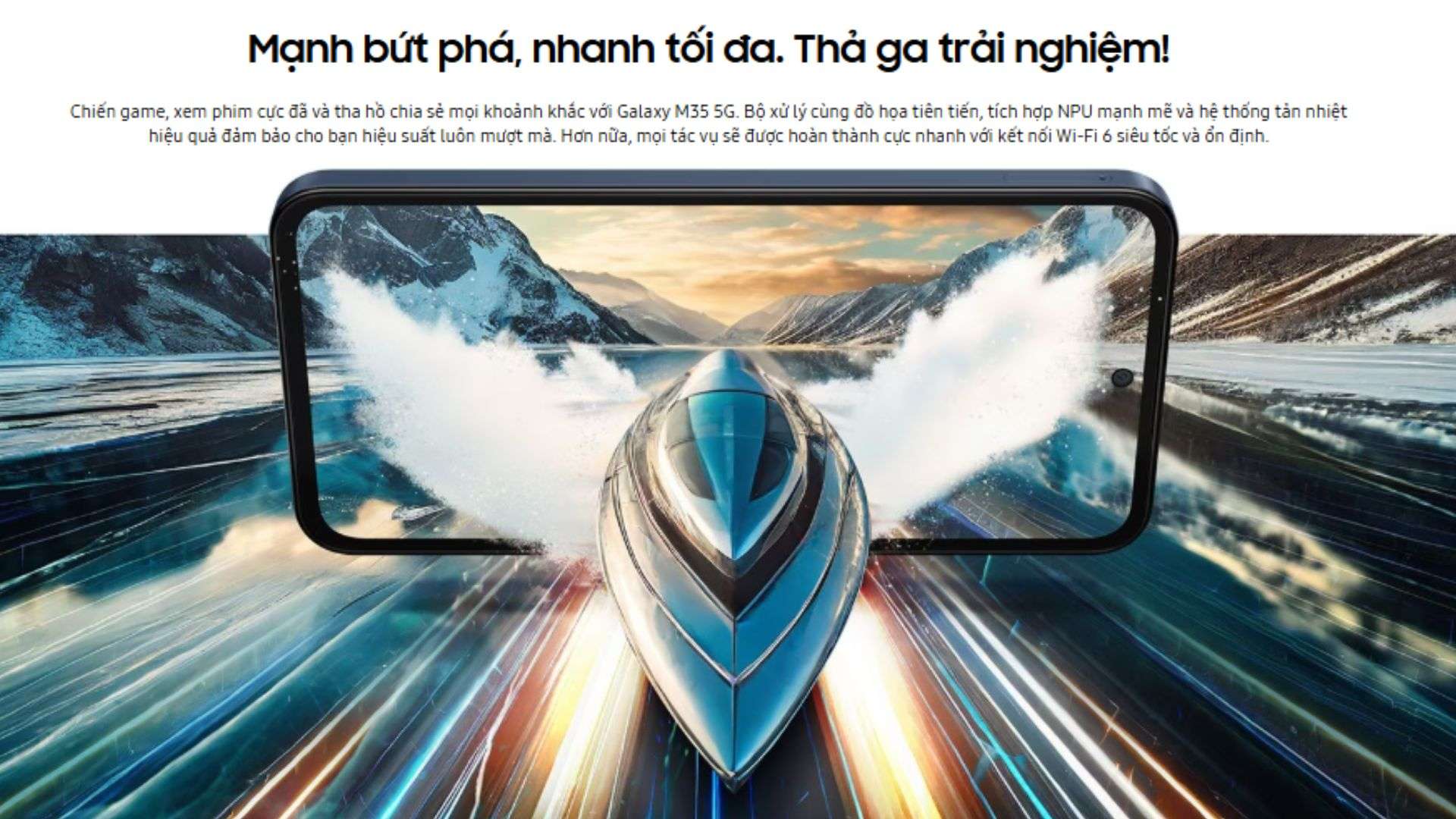 Được trang bị chipset Exynos 1380 mạnh mẽ, Galaxy M35 kết hợp cùng 8GB RAM và 256GB bộ nhớ trong (hỗ trợ thẻ MicroSD lên đến 1TB), đảm bảo xử lý mượt mà mọi tác vụ từ đa nhiệm, chơi game nặng đến lưu trữ dữ liệu lớn. Công nghệ Vapor Cooling Chamber giúp tản nhiệt hiệu quả, giữ thiết bị ổn định ngay cả khi sử dụng liên tục. Viên pin 6.000mAh cho thời gian sử dụng kéo dài hơn một ngày, phù hợp cho cả công việc và giải trí. Hỗ trợ sạc nhanh 25W (bộ sạc bán riêng) giúp nạp đầy pin nhanh chóng. Kết nối 5G và Wi-Fi 6 mang đến tốc độ truyền tải siêu nhanh, lý tưởng cho streaming, gaming và công việc trực tuyến.