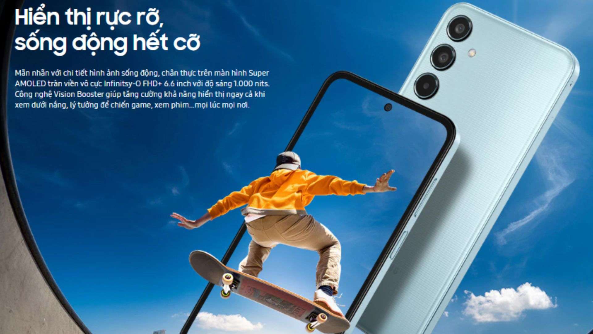 Galaxy M35 sở hữu màn hình Super AMOLED FHD+ 6.6 inch với độ phân giải 1080 x 2340, mang đến hình ảnh sống động, màu sắc chân thực và chi tiết sắc nét. Công nghệ Vision Booster đạt độ sáng tối đa 1.000 nits, đảm bảo hiển thị rõ ràng ngay cả dưới ánh nắng trực tiếp. Tần số quét 120Hz mang lại trải nghiệm mượt mà khi chơi game, xem video hay lướt mạng xã hội. Màn hình Infinity-O tràn viền tối ưu hóa không gian hiển thị, kết hợp với kính cường lực Corning Gorilla Glass Victus+ giúp tăng độ bền và bảo vệ màn hình vượt trội. Chứng nhận Eye Care của SGS giảm ánh sáng xanh, bảo vệ mắt hiệu quả khi sử dụng lâu dài.