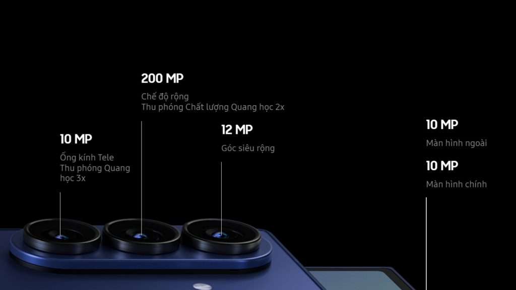 | Độ phân giải camera sau | Camera chính: 200 MP Camera góc siêu rộng: 12 MP Camera tele: 10 MP Camera dưới màn hình: 10MP Zoom quang học (tele): 3x, 2x Zoom kỹ thuật số: 10x |