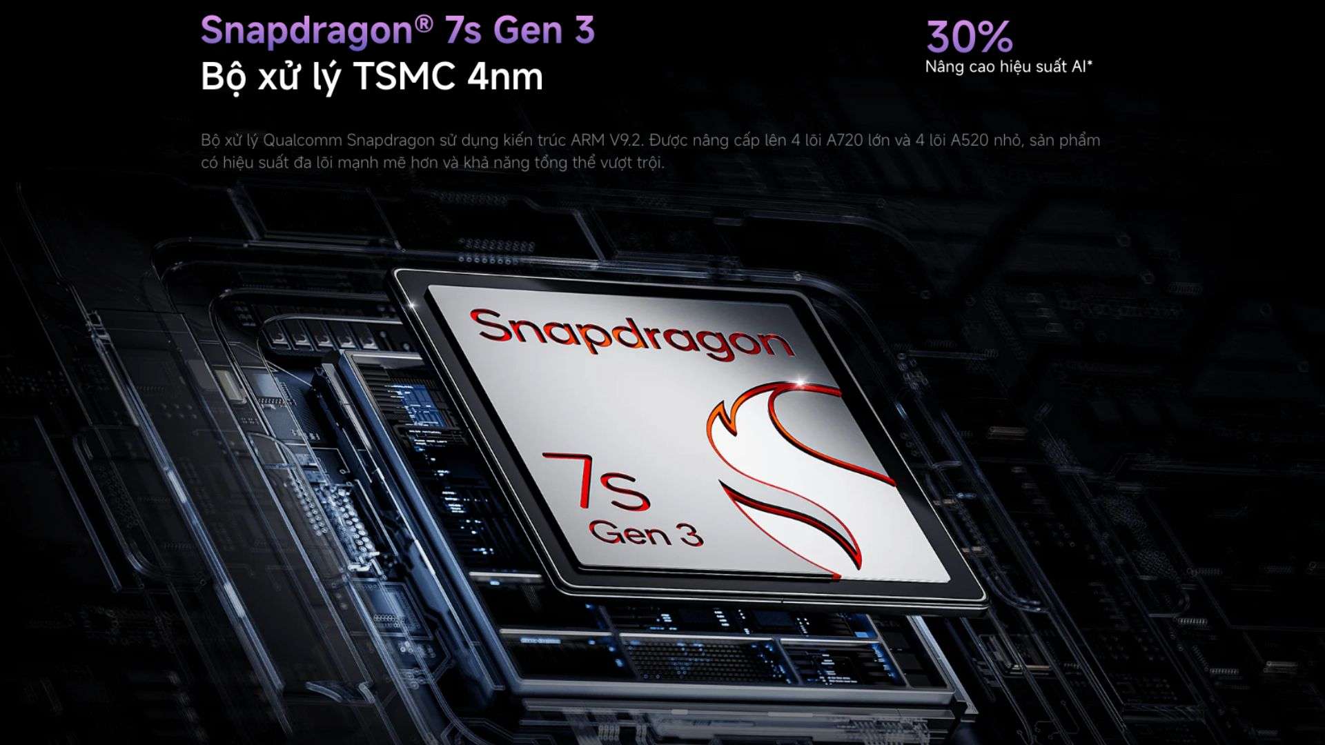 Redmi Note 14 Pro+ 5G được trang bị chip snapdragon 7s Gen 3 được sản xuất trên tiến trình 4nm tiên tiến của TSMC mang lại hiệu năng cao và khả năng tiết kiệm năng lượng hơn đáng kể so với thế hệ tiền nhiệm. CPU bao gồm: