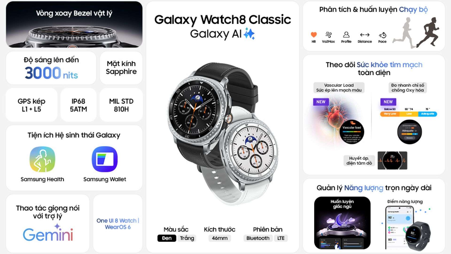 Galaxy Watch 8 Classic là người bạn đồng hành lý tưởng cho sức khỏe và phong cách sống năng động. Đồng hồ tích hợp nhiều tính năng theo dõi sức khỏe tiên tiến như: