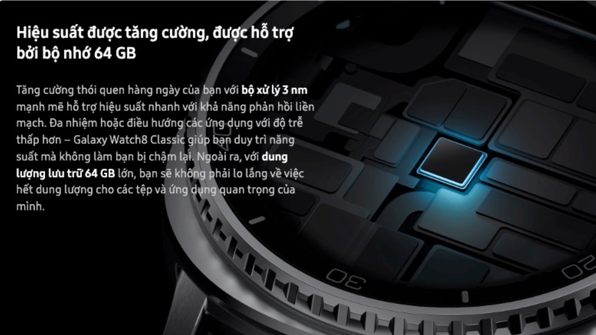 Về hiệu năng, chiếc đồng hồ được trang bị chip 3nm AD mạnh mẽ, giúp tăng tốc độ xử lý và tối ưu hóa thời lượng pin. Với dung lượng 445mAh, Galaxy Watch 8 Classic hỗ trợ sạc nhanh không dây và kéo dài tới 44 giờ sử dụng (tùy thuộc vào chế độ và tính năng được kích hoạt). Bộ nhớ RAM 2GB và dung lượng lưu trữ 64GB đủ để lưu trữ các ứng dụng và dữ liệu cần thiết.