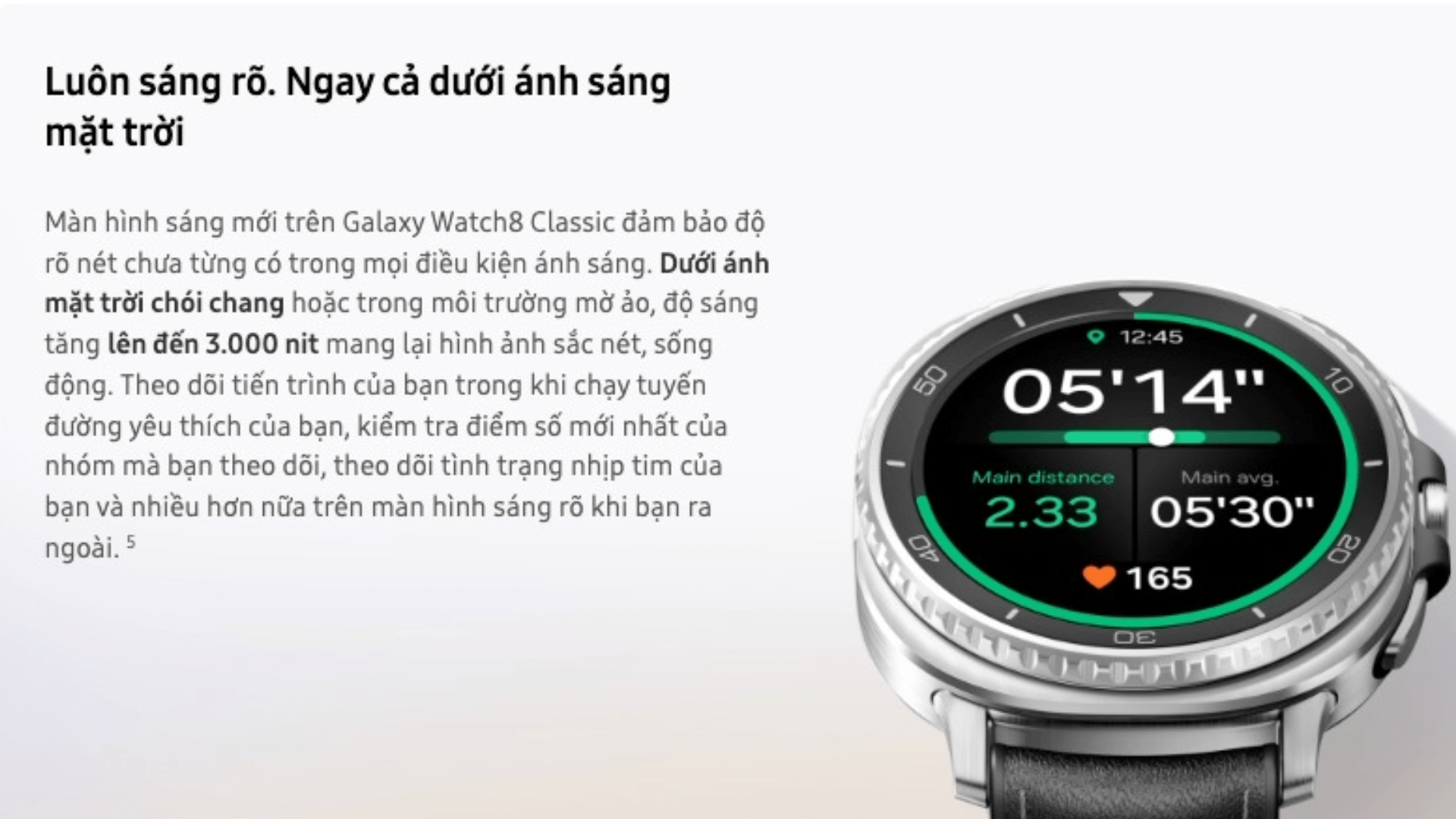 Màn hình Super AMOLED 1.3 inch của Galaxy Watch 8 Classic đạt độ sáng tối đa 3000 nits – cao nhất trong số các đồng hồ thông minh của Samsung, đảm bảo hiển thị rõ ràng ngay cả dưới ánh nắng gay gắt. Tần số quét mượt mà cùng viền tràn viền mang lại trải nghiệm xem tối ưu, đặc biệt khi sử dụng các ứng dụng như Galaxy AI.