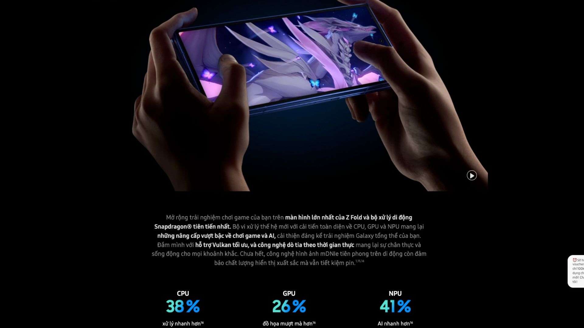 Galaxy Z Fold7 được trang bị chip Snapdragon 8 Elite for Galaxy, mang đến hiệu năng vượt trội so với Z Fold6. Cụ thể, NPU nhanh hơn 41%, CPU nhanh hơn 38%, và GPU nhanh hơn 26%, đảm bảo xử lý mượt mà mọi tác vụ, từ chỉnh sửa video 4K đến chơi game đồ họa nặng. Công nghệ Vulkanreal-time ray tracing tối ưu hóa trải nghiệm chơi game với hình ảnh chân thực và hiệu ứng ánh sáng sống động.