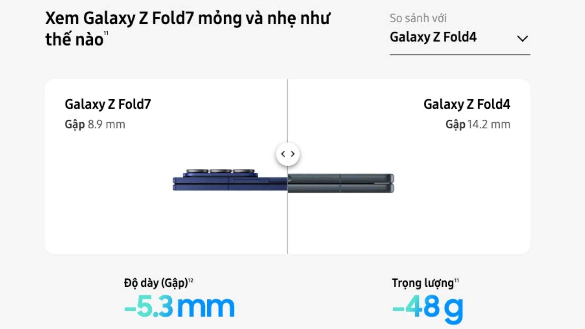Galaxy Z Fold7 được Samsung giới thiệu như thế hệ điện thoại gập mỏng nhẹ nhất từ trước đến nay, vượt xa các phiên bản tiền nhiệm về cả thiết kế và cảm giác sử dụng. Khi gập lại, máy chỉ dày 8.9mm, giảm 25% so với Z Fold6. Khi mở ra, độ dày ấn tượng 4.2mm mang đến trải nghiệm cầm nắm thoải mái, gần như tương đương một chiếc điện thoại phẳng cao cấp. Với trọng lượng chỉ 215g, nhẹ hơn cả Galaxy S25 Ultra (218g), Galaxy Z Fold7 mang lại sự tiện lợi tối đa cho người dùng thường xuyên di chuyển.