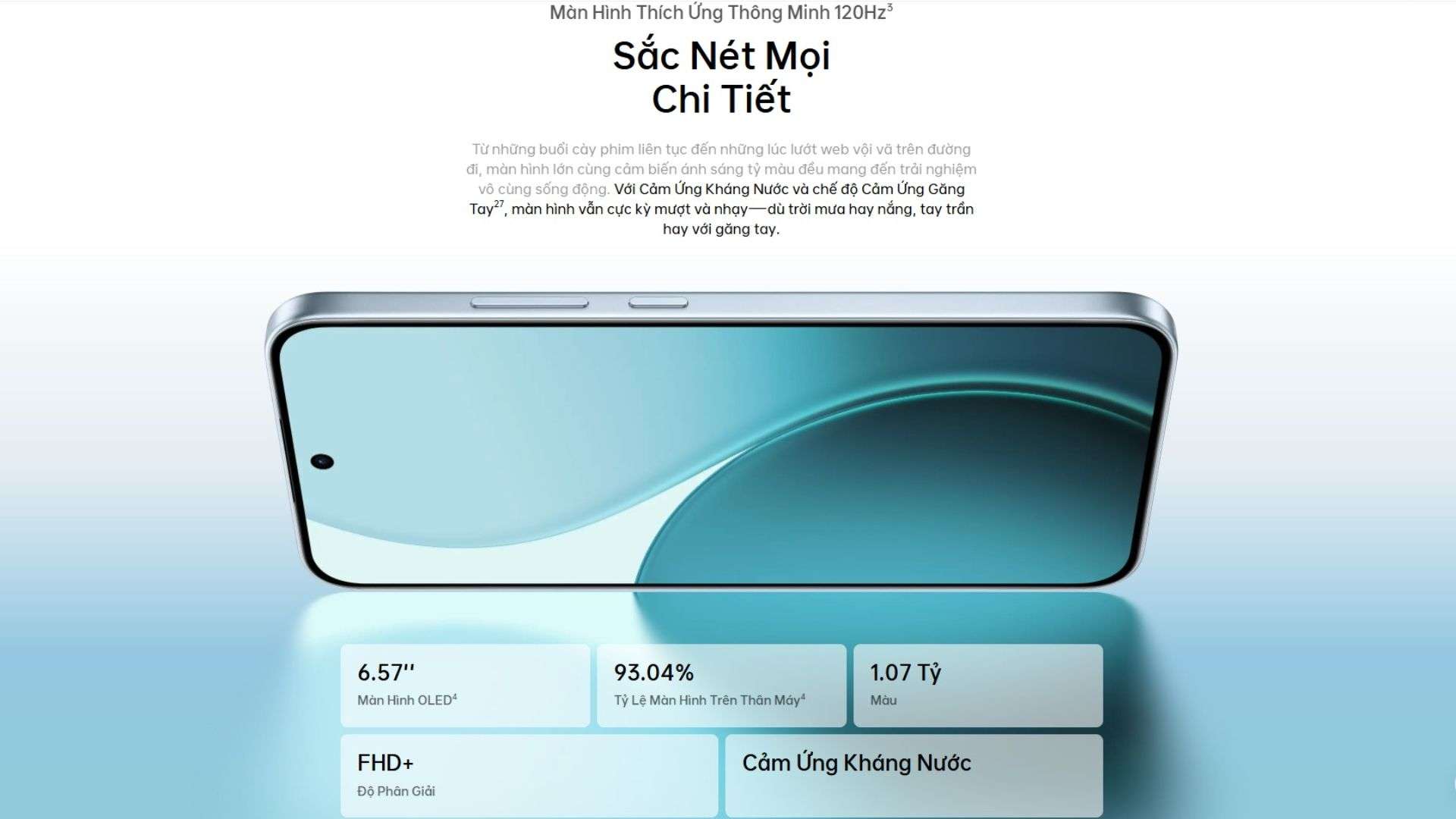 So với các mẫu Reno trước, Reno14 F cải tiến ở viền màn hình mỏng hơn, đạt tỷ lệ màn hình/thân máy 93.04%. Cảm giác khi sử dụng là một thiết bị gọn gàng, dễ thao tác bằng một tay, dù kích thước tổng thể không nhỏ do màn hình lớn.