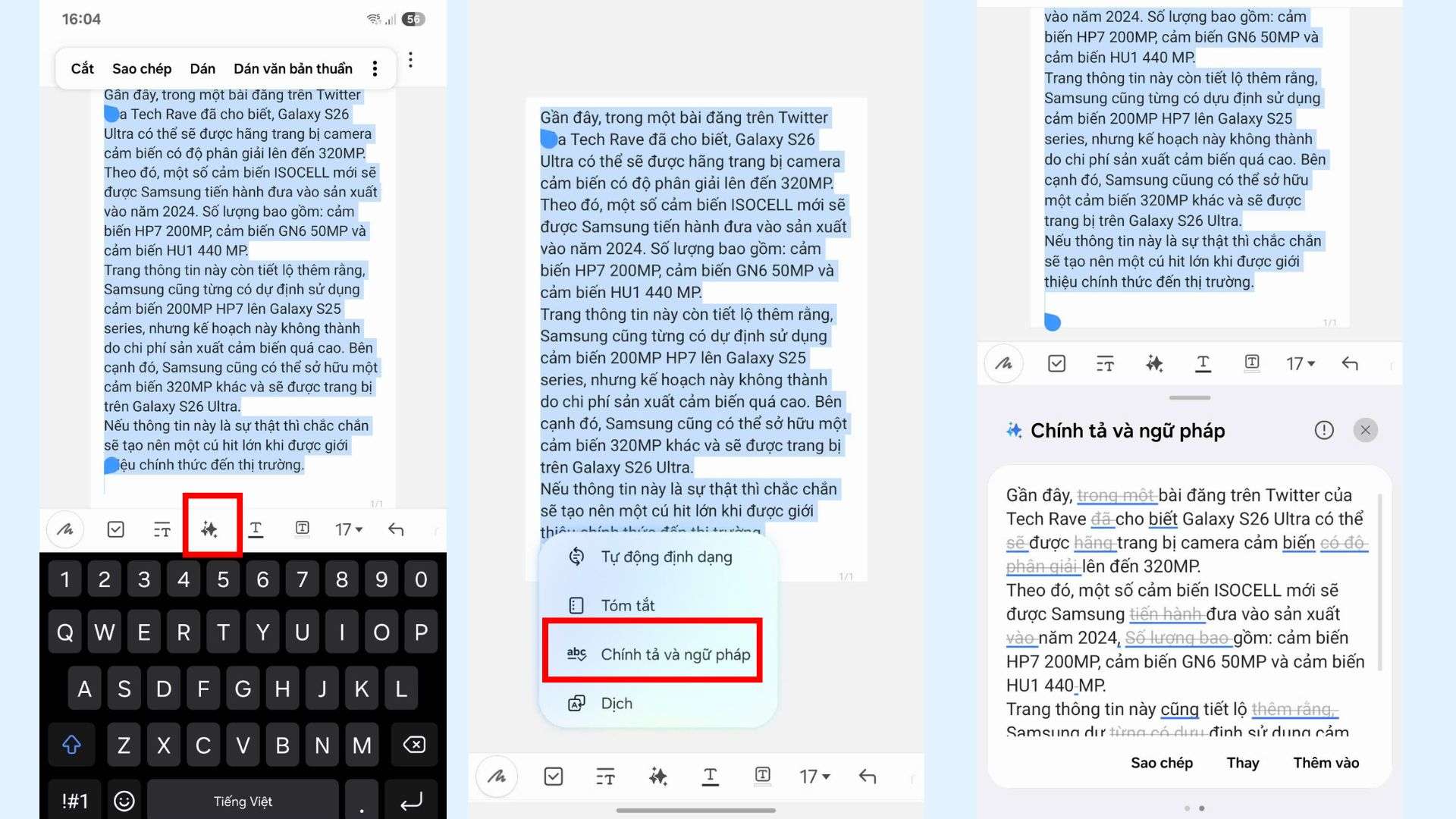 Để sử dụng, bạn chỉ cần mở ghi chú cần kiểm tra chính tả trong ứng dụng Notes, sau đó chạm vào biểu tượng “Galaxy AI” trên bàn phím. Tiếp theo, chọn tùy chọn “Sửa chính tả”. AI sẽ tự động quét và hiển thị các lỗi chính tả, ngữ pháp đã được sửa. Bạn có thể xem lại các lỗi này và lựa chọn sao chép văn bản đã sửa vào bộ nhớ tạm hoặc thay thế hoàn toàn văn bản gốc bằng phiên bản đã được chỉnh sửa.