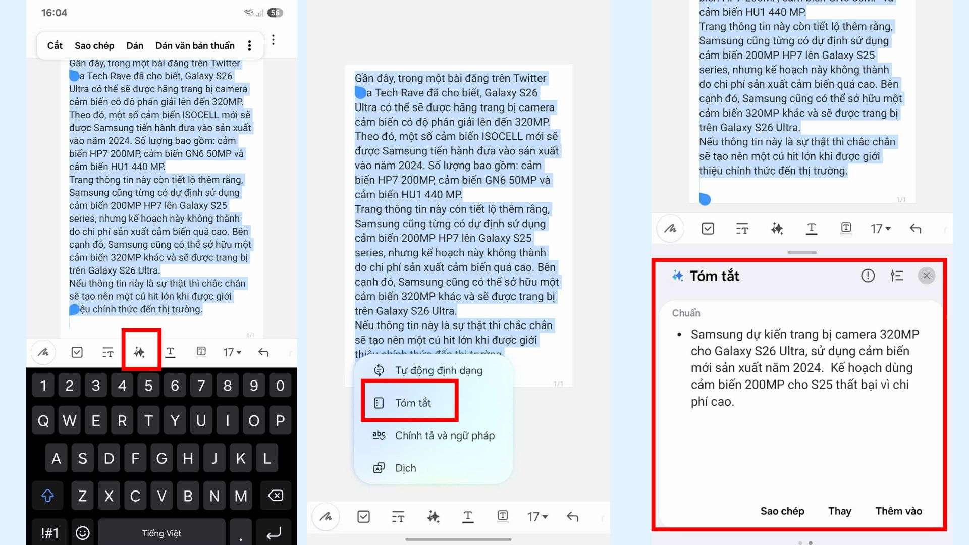 Đầu tiên, chỉ cần mở ghi chú chứa nội dung cần tóm tắt trong ứng dụng Samsung Notes. Sau đó, chạm vào biểu tượng “Galaxy AI” trên bàn phím và chọn tùy chọn “Tóm tắt”. Ngay lập tức, AI sẽ tự động phân tích và tạo ra một bản tóm tắt ngắn gọn, súc tích, hiển thị trên màn hình. Người dùng có thể xem lại bản tóm tắt này và lựa chọn sao chép vào bộ nhớ tạm hoặc thay thế hoàn toàn văn bản gốc bằng bản tóm tắt được tạo ra.