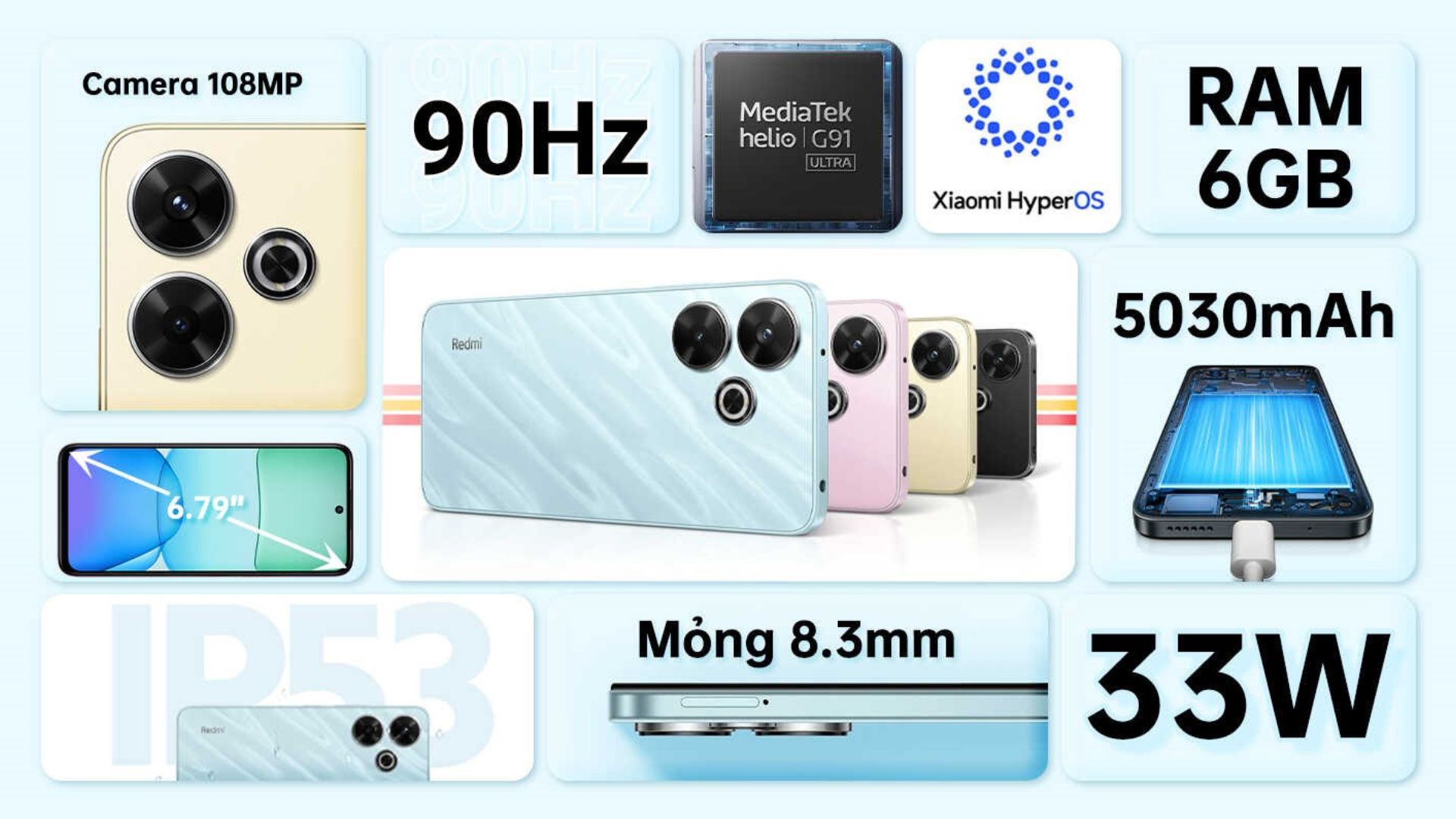 Redmi 13 được trang bị màn hình AMOLED 6.43 inch với độ phân giải cao, mang lại hình ảnh sắc nét và màu sắc sống động. Máy sử dụng chip xử lý MediaTek Helio G88, hỗ trợ tốt cho cả công việc và giải trí nhẹ. Điểm nổi bật khác là viên pin 5000mAh, kết hợp với sạc nhanh 18W giúp người dùng yên tâm sử dụng suốt cả ngày.