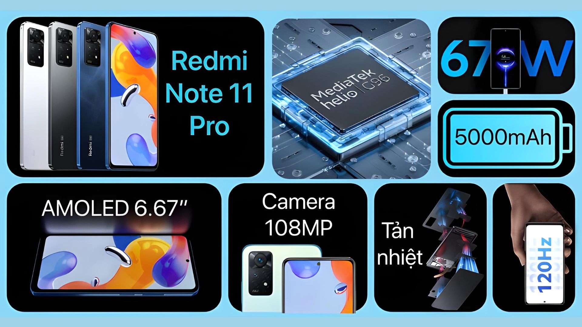 Redmi Note 11 Pro gây ấn tượng với camera chính 108MP, mang lại khả năng chụp ảnh chuyên nghiệp với độ chi tiết cao. Màn hình AMOLED hỗ trợ tần số quét 120Hz, giúp hiển thị mượt mà và sắc nét hơn. Hiệu năng mạnh mẽ của chip Helio G96 kết hợp cùng dung lượng RAM lớn giúp máy chạy đa nhiệm dễ dàng.