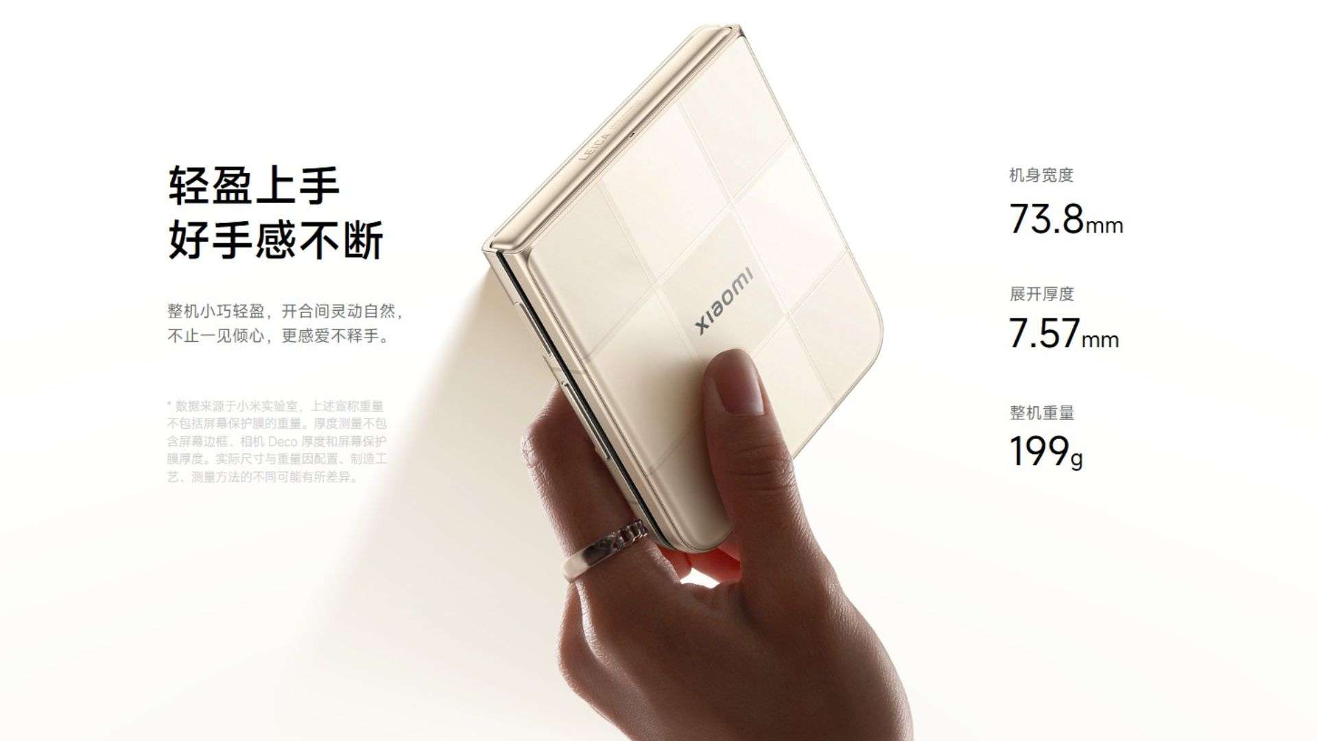Xiaomi MIX Flip 2 có trọng lượng chỉ 199g và kích thước gọn gàng khi gập (86,13 x 73,8 x 15,87 mm), cùng bốn tùy chọn màu sắc thời thượng: Vàng Kẻ Ô, Trắng Vỏ Sò, Tím Tinh Vân và Xanh Mận. Độ bền của bản lề cũng được cải thiện đáng kể, với khả năng chống rơi tốt hơn 20% và chống va đập tốt hơn 30% so với thế hệ trước.