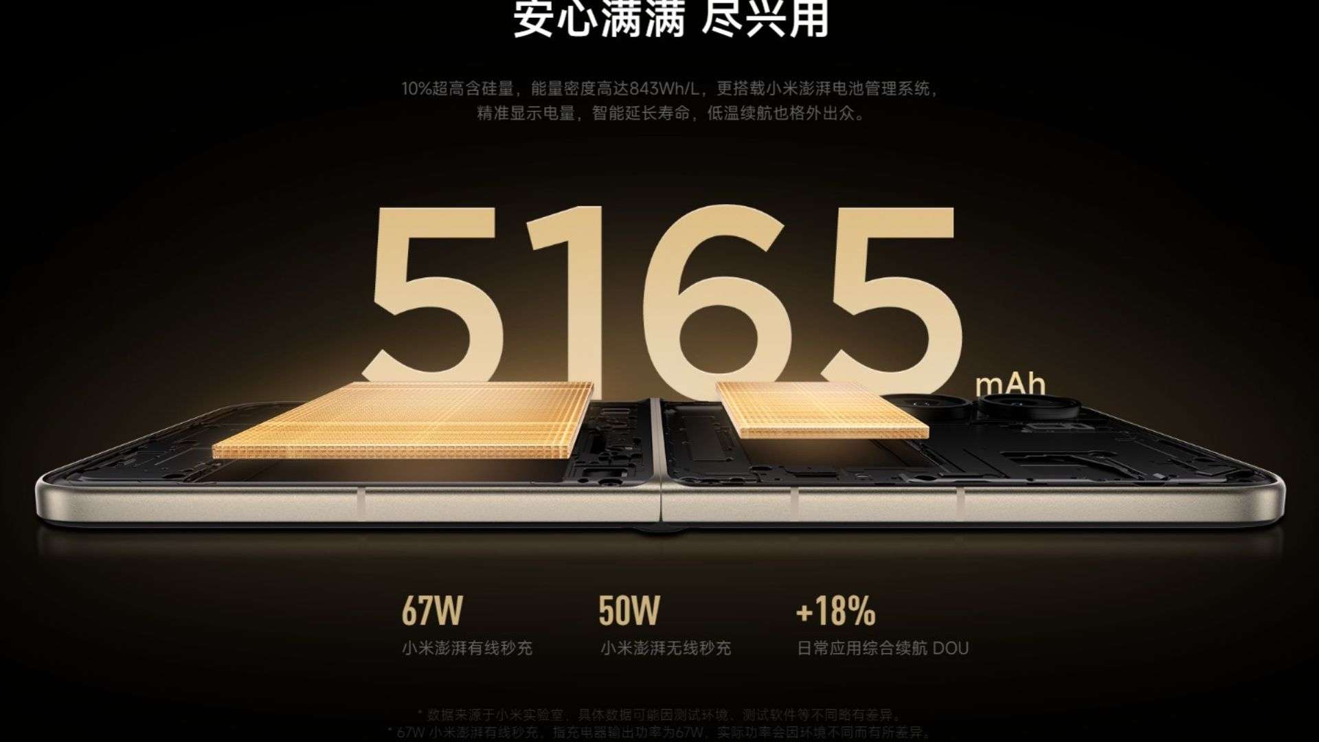 Một trong những ưu điểm vượt trội của Xiaomi MIX Flip 2 là viên pin dung lượng 5.165mAh, lớn hơn đáng kể so với các đối thủ như Z Flip7 (thường chỉ khoảng 4.000mAh). Công nghệ pin Silicon-Carbon với 10% anode silicon giúp đạt mật độ năng lượng cao 843 Wh/L, đảm bảo thời gian sử dụng kéo dài. Máy hỗ trợ sạc nhanh có dây 67W và sạc không dây 50W, giúp nạp đầy pin trong thời gian ngắn.