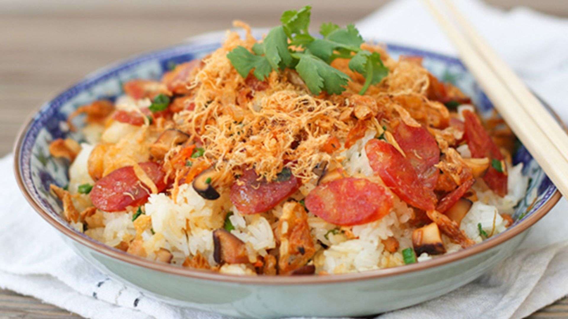 - Sau khi xôi chín, mở nắp, trộn xôi với thịt đã xào, lạp xưởng và hành phi. Thêm trứng luộc cắt đôi lên trên để món xôi thêm đẹp mắt và hấp dẫn.