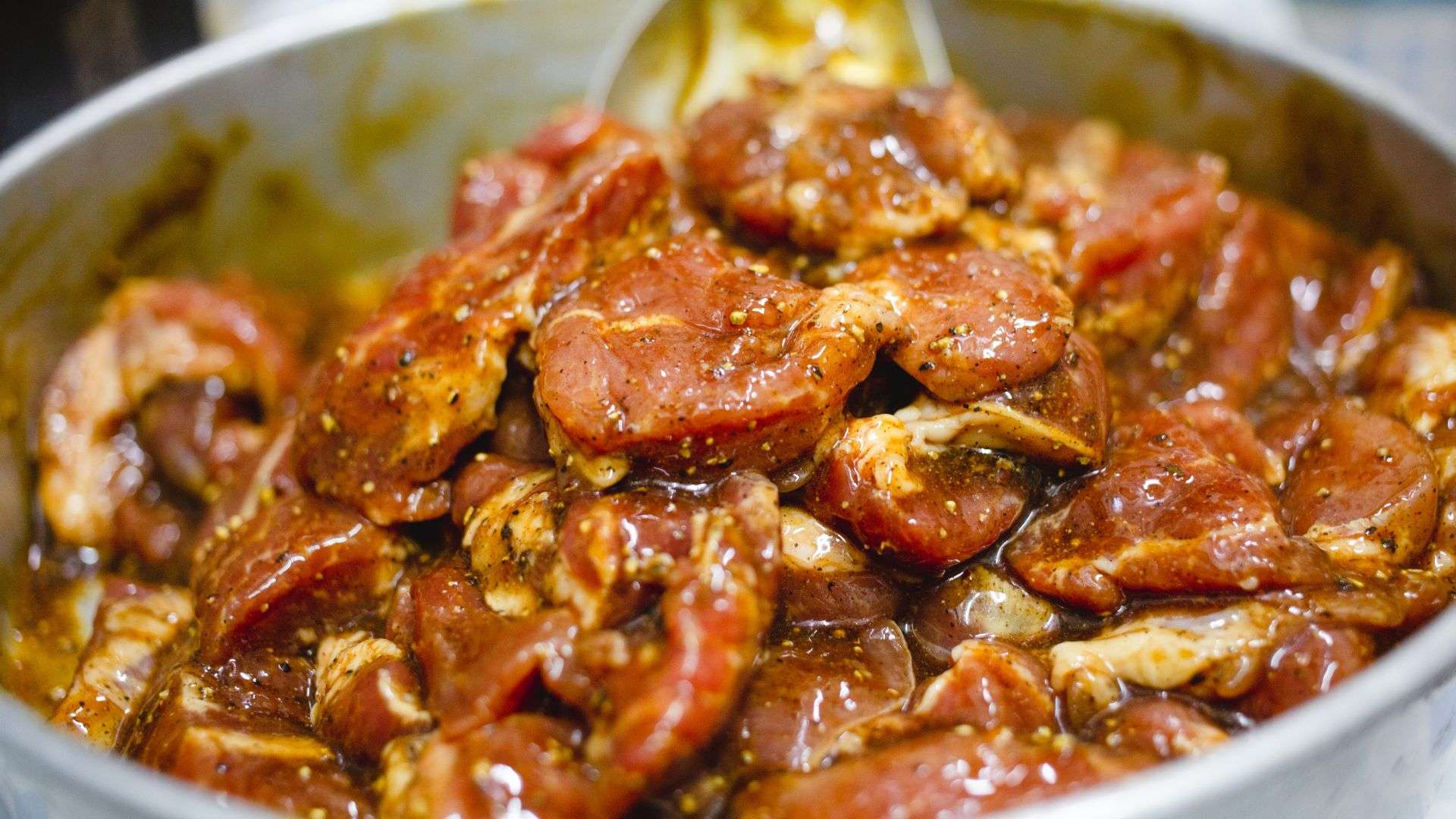 Rửa sạch thịt heo, thái miếng nhỏ vừa ăn. Ướp thịt với nước mắm, đường, hạt nêm và một ít tiêu cho thấm gia vị theo tỉ lệ sau (có thể gia giảm cho vừa khẩu vị):