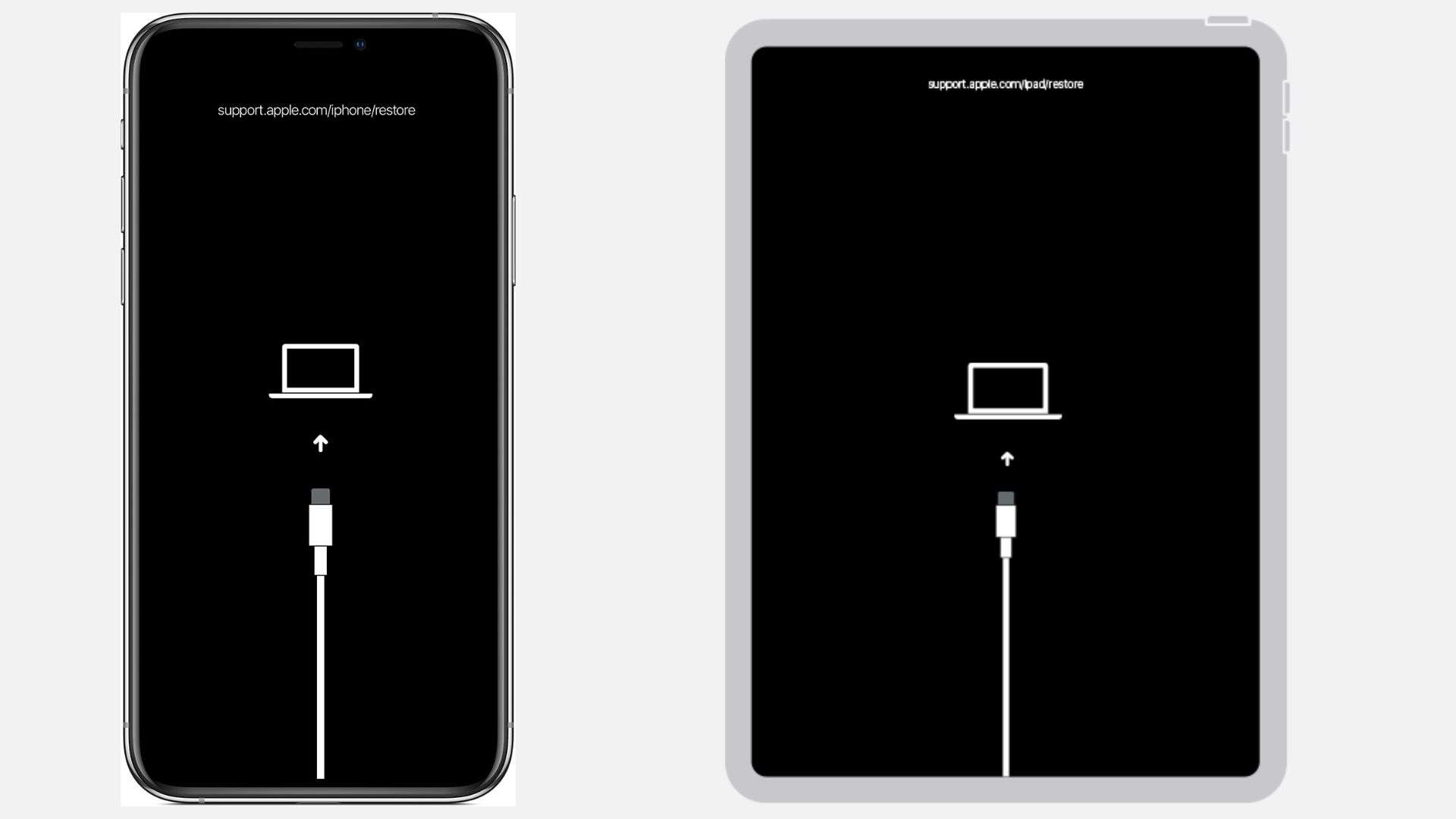 - Nhấn và giữ nút Nguồn (Side) cho đến khi màn hình chế độ khôi phục xuất hiện (biểu tượng máy tính và cáp Lightning).