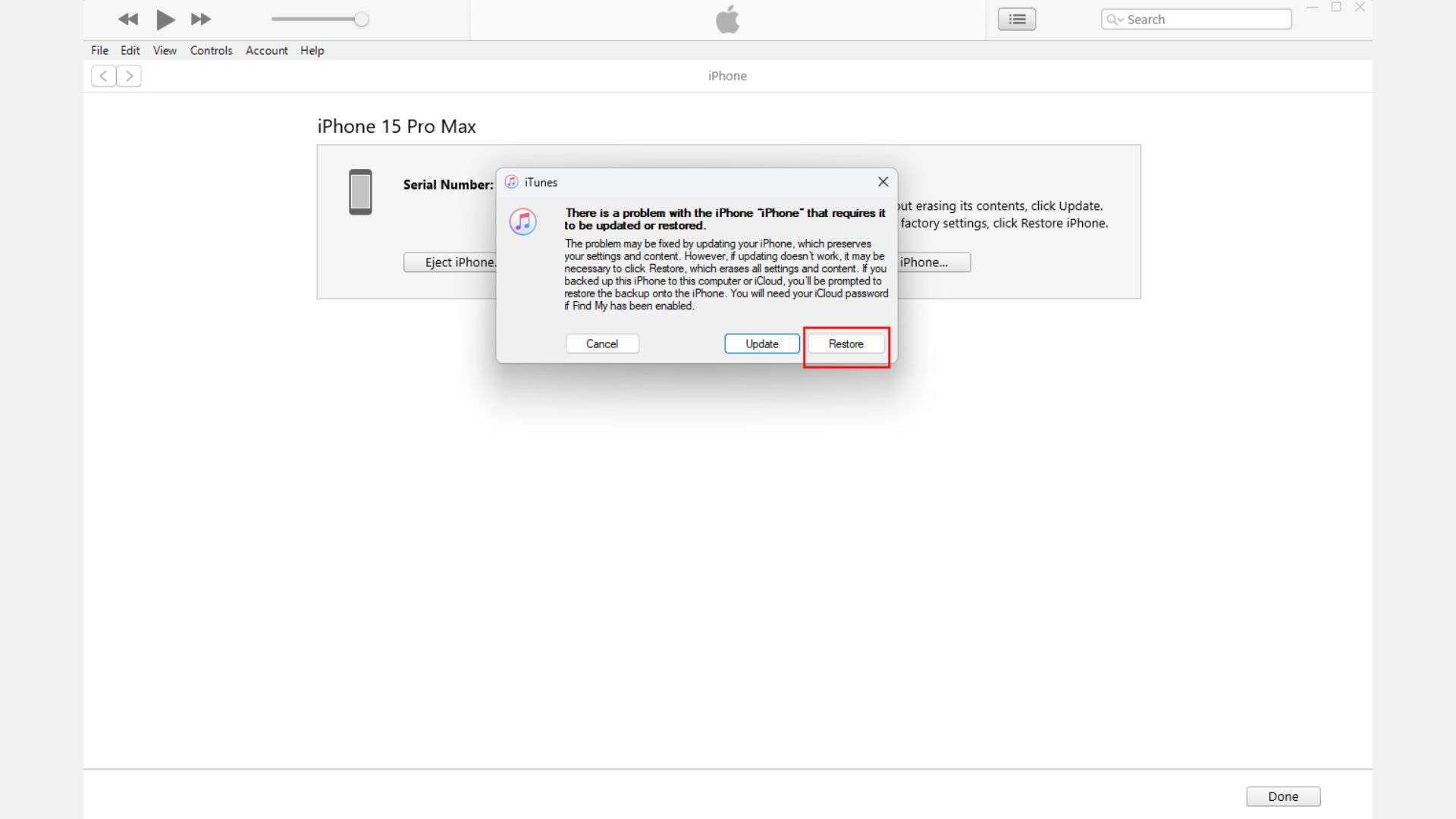 Khi thiết bị ở chế độ khôi phục, Finder hoặc iTunes sẽ hiển thị thông báo với tùy chọn Khôi phục (Restore) hoặc Cập nhật (Update).