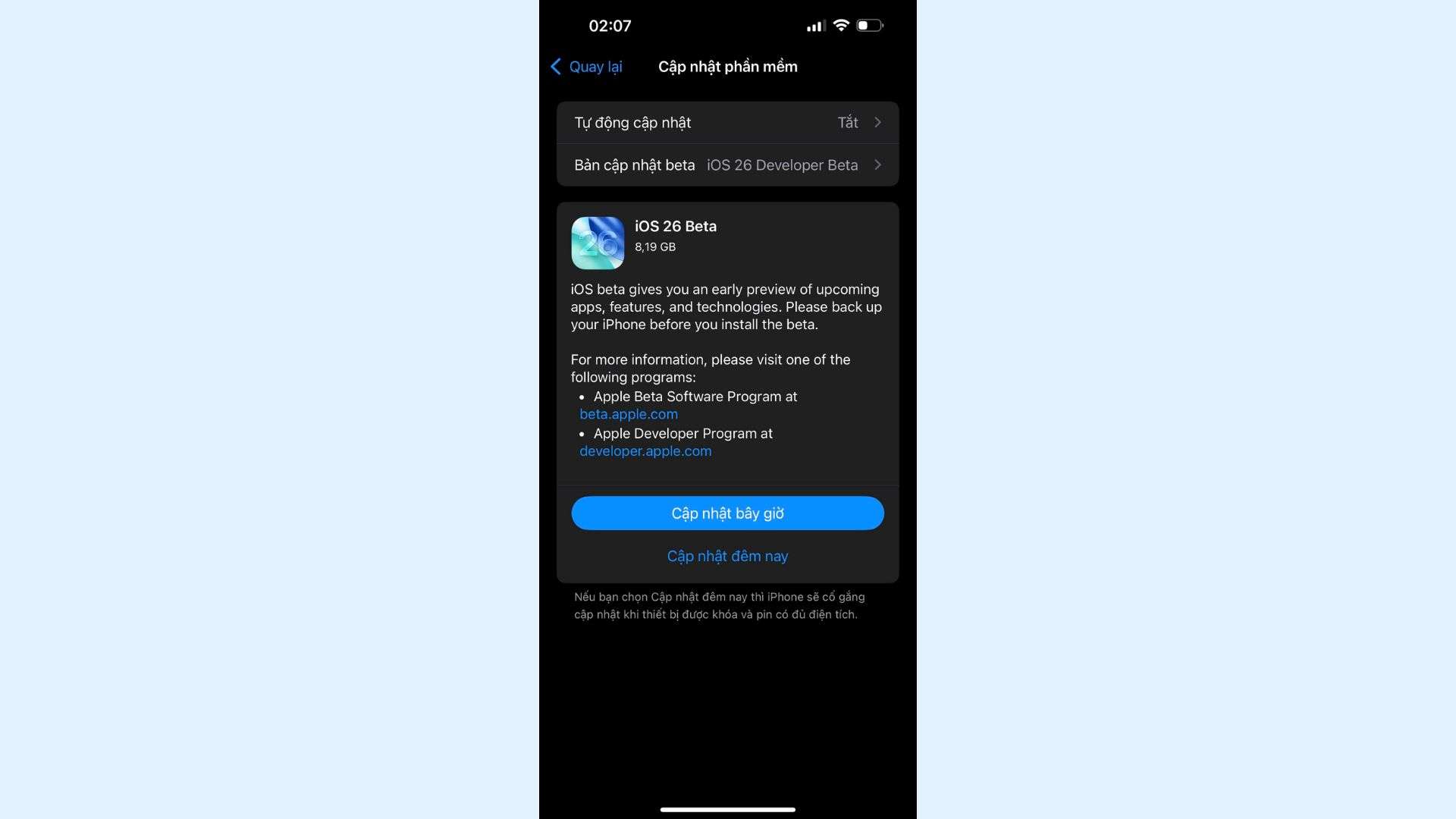 - Tải bản cập nhật: Khi bản iOS 26 Beta 1 xuất hiện, chọn Tải về và Cài đặt qua OTA.