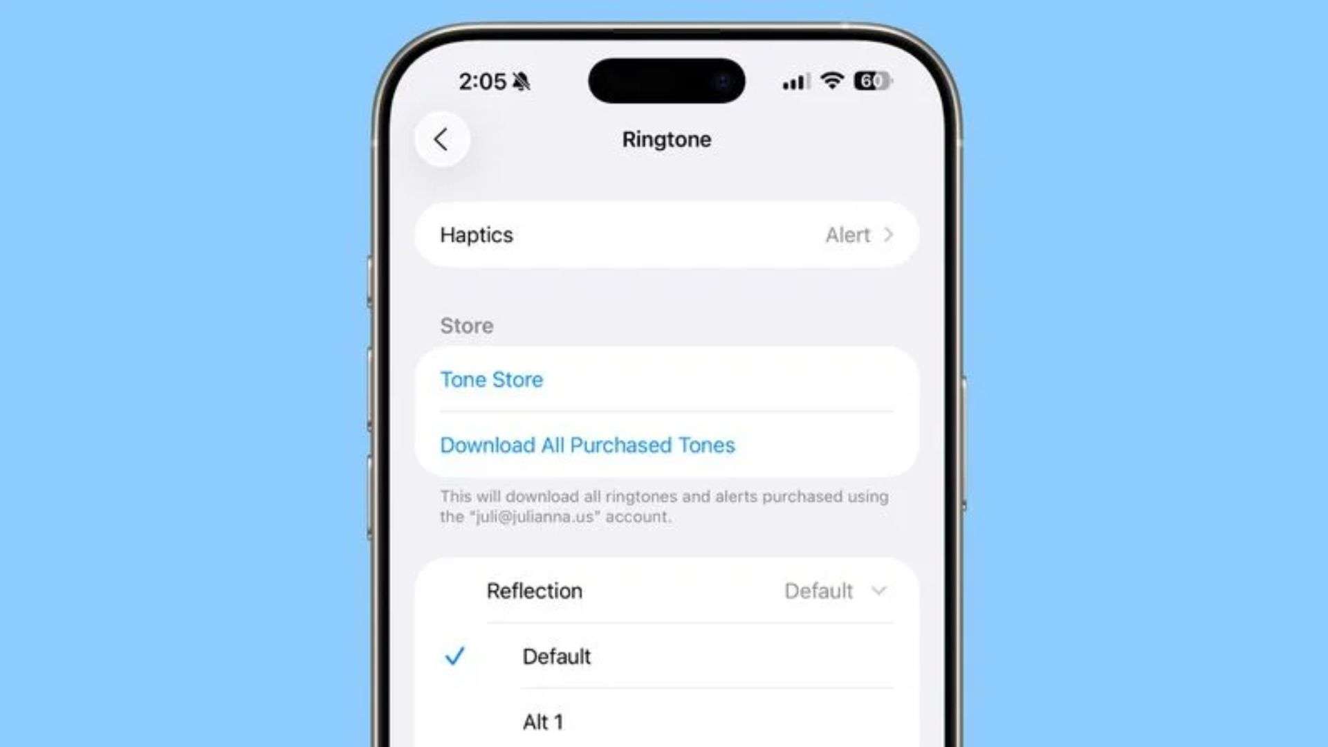 iOS 26 Beta 2 mang đến một tùy chọn ringtone mới có tên “Alt 1” thuộc dòng Reflection. Người dùng có thể chọn ringtone này bằng cách vào Cài đặt > Âm thanh & Cảm ứng > Nhạc chuông và chọn Alt 1 dưới mục Reflection. Mặc dù ringtone này đã xuất hiện trong mã của Beta 1, nhưng đến Beta 2 mới chính thức có mặt trong giao diện cài đặt.