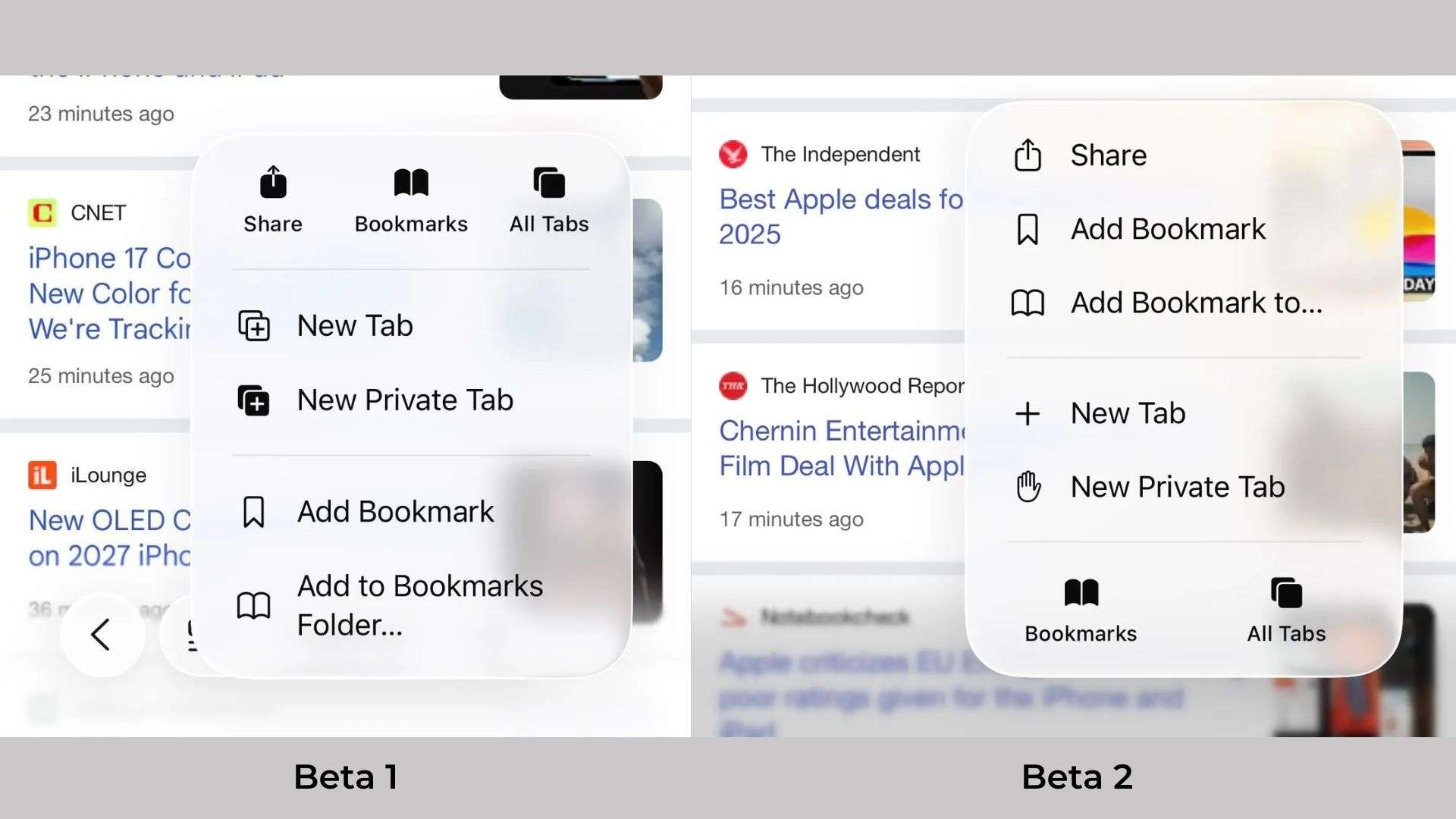 - Safari More Menu: Các điều khiển trong menu “…” của Safari được sắp xếp lại với thứ tự và biểu tượng mới, nhưng chức năng không thay đổi.