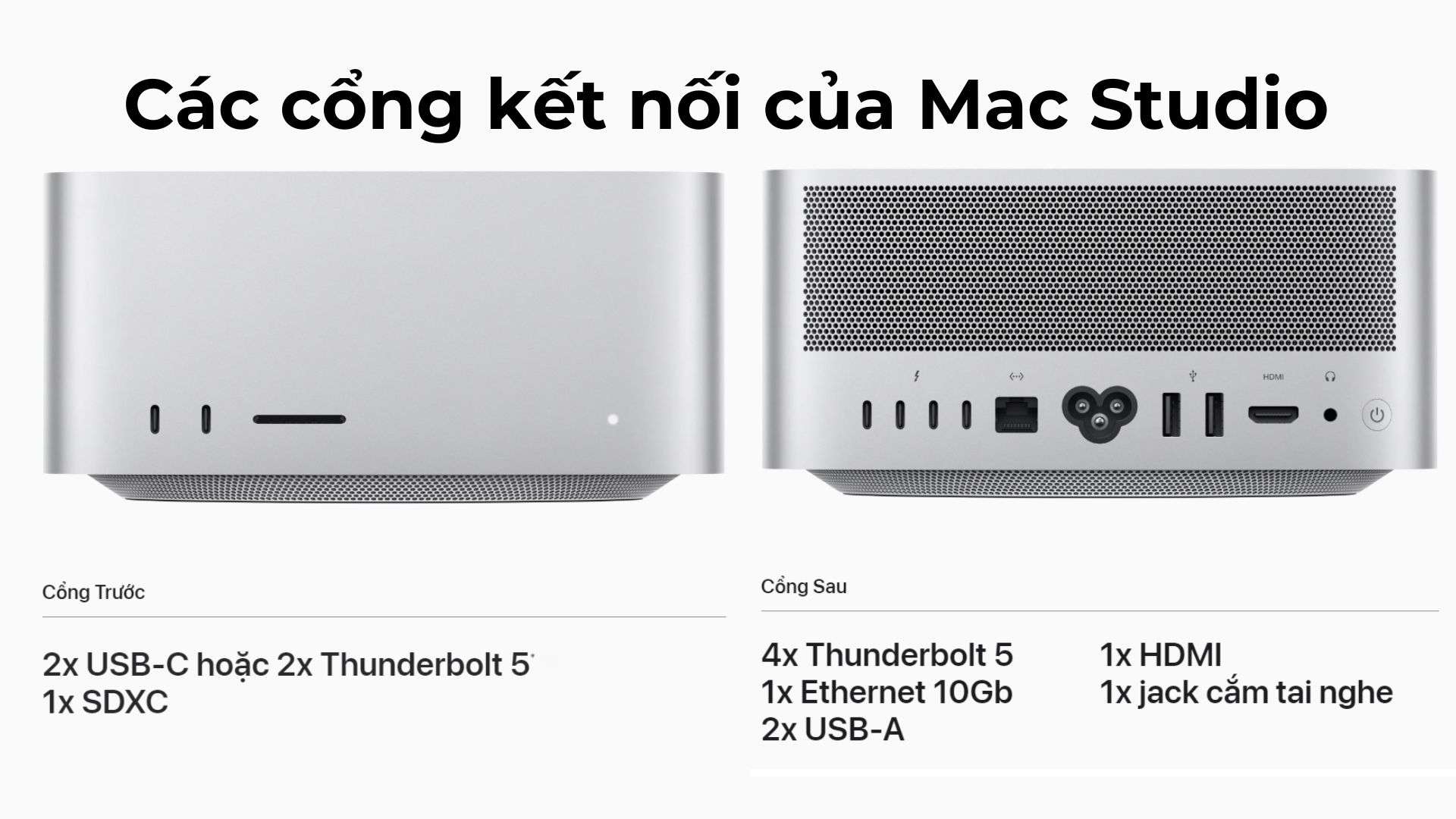 Khả năng xuất âm thanh đa kênh cũng được nâng cấp, mang lại trải nghiệm giải trí đa phương tiện sống động và chân thực. Ngoài ra, Mac Studio được trang bị các chuẩn kết nối mạnh mẽ như Thunderbolt 5 và HDMI 2.1, giúp mở rộng khả năng kết nối với các thiết bị ngoại vi cao cấp, từ màn hình 8K đến hệ thống âm thanh chuyên nghiệp.