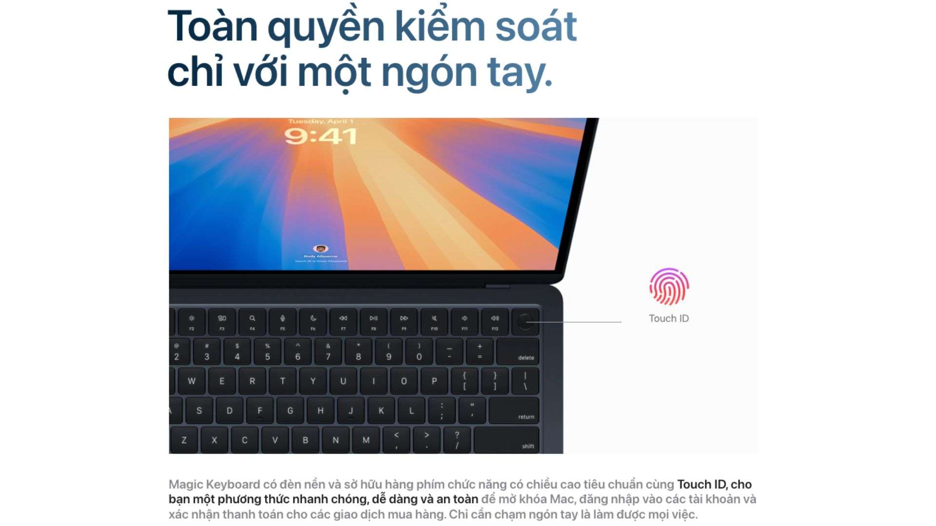 Touch ID trên MacBook Air M4 tiếp tục khẳng định thế mạnh bảo mật của Apple, tích hợp trên bàn phím để mang lại tiện lợi và an toàn. Người dùng chỉ cần chạm nhẹ để mở khóa máy, đăng nhập ứng dụng hay xác nhận thanh toán, hoạt động ổn định ngay cả khi tay ẩm.