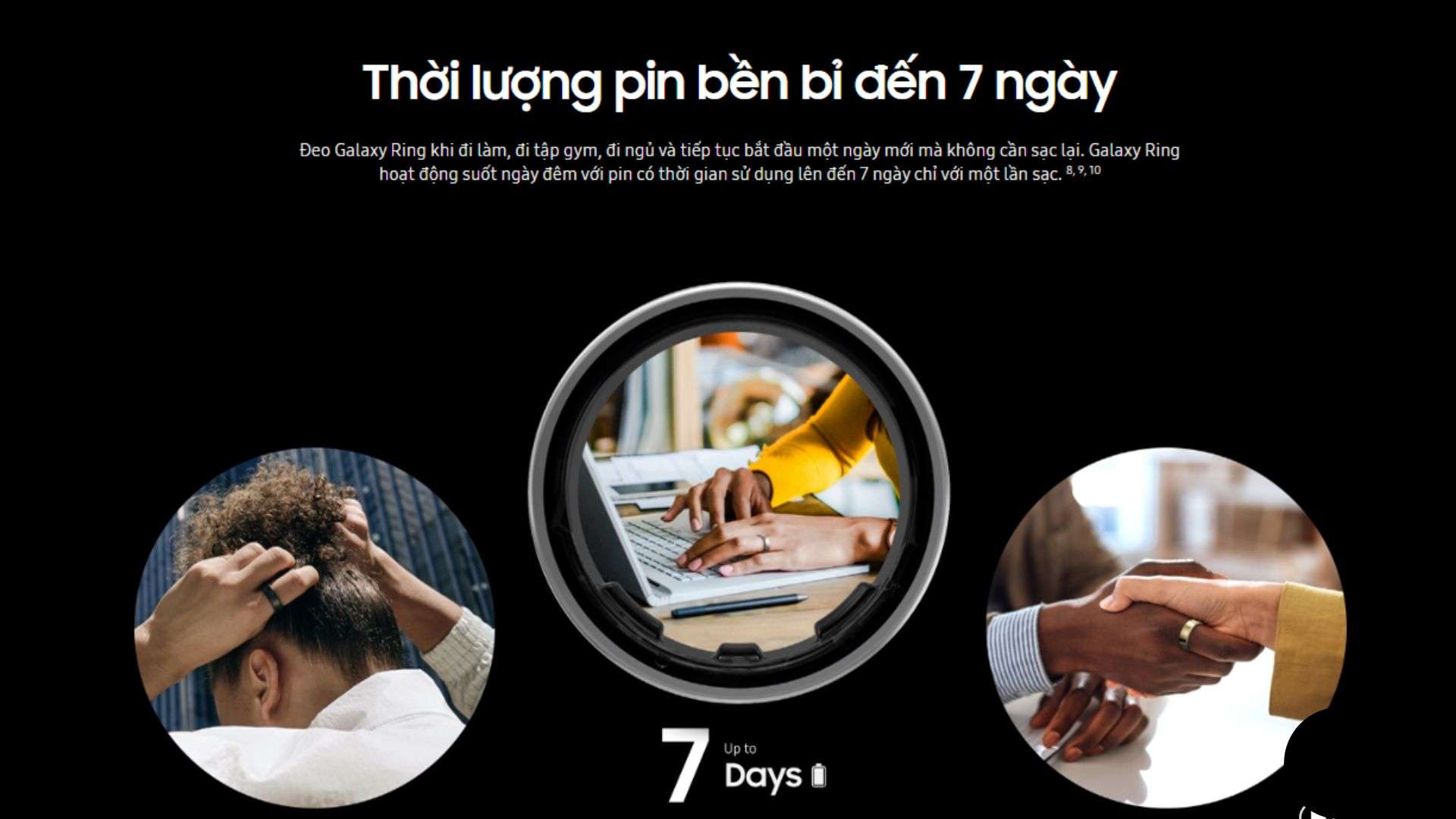 Galaxy Ring có thời lượng pin từ 5 đến 7 ngày, tùy theo size nhẫn và cường độ sử dụng – đây là một ưu điểm so với nhiều đồng hồ thông minh hiện tại. Hộp sạc cũng được thiết kế đẹp và gọn gàng, tương tự như case tai nghe Galaxy Buds. Tuy nhiên, việc chỉ hỗ trợ sạc qua case và không có tuỳ chọn sạc nhanh khiến một số người dùng e ngại về trải nghiệm lâu dài.