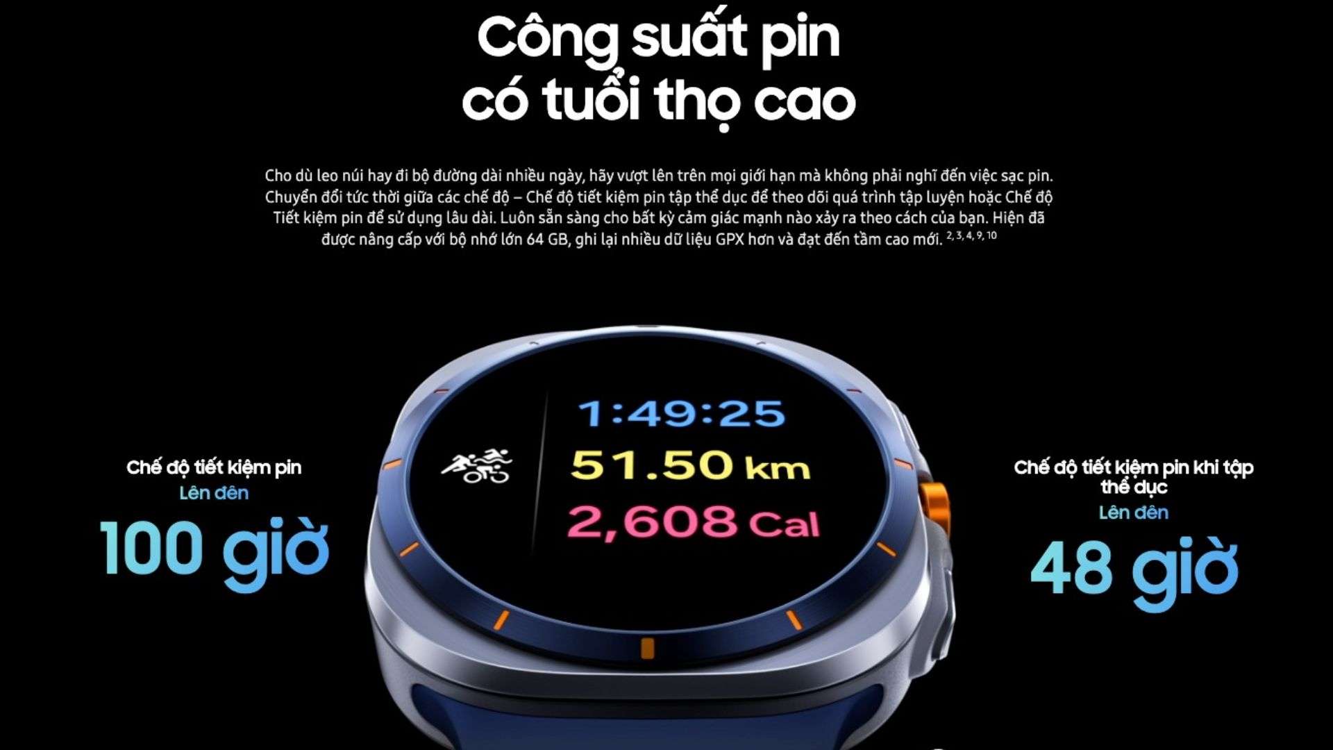 Được trang bị chip xử lý 3nm AD, Galaxy Watch Ultra 2025 mang lại hiệu năng vượt trội, nhanh hơn đáng kể so với thế hệ trước. Với 2GB RAM64GB bộ nhớ trong, đồng hồ đảm bảo xử lý mượt mà các tác vụ từ theo dõi sức khỏe đến chạy ứng dụng. Pin dung lượng 590mAh hỗ trợ sạc nhanh không dây, cho thời gian sử dụng lên đến 48 giờ ở một số chế độ, hoặc 100 giờ ở chế độ tiết kiệm pin, đáp ứng nhu cầu sử dụng liên tục trong ngày.