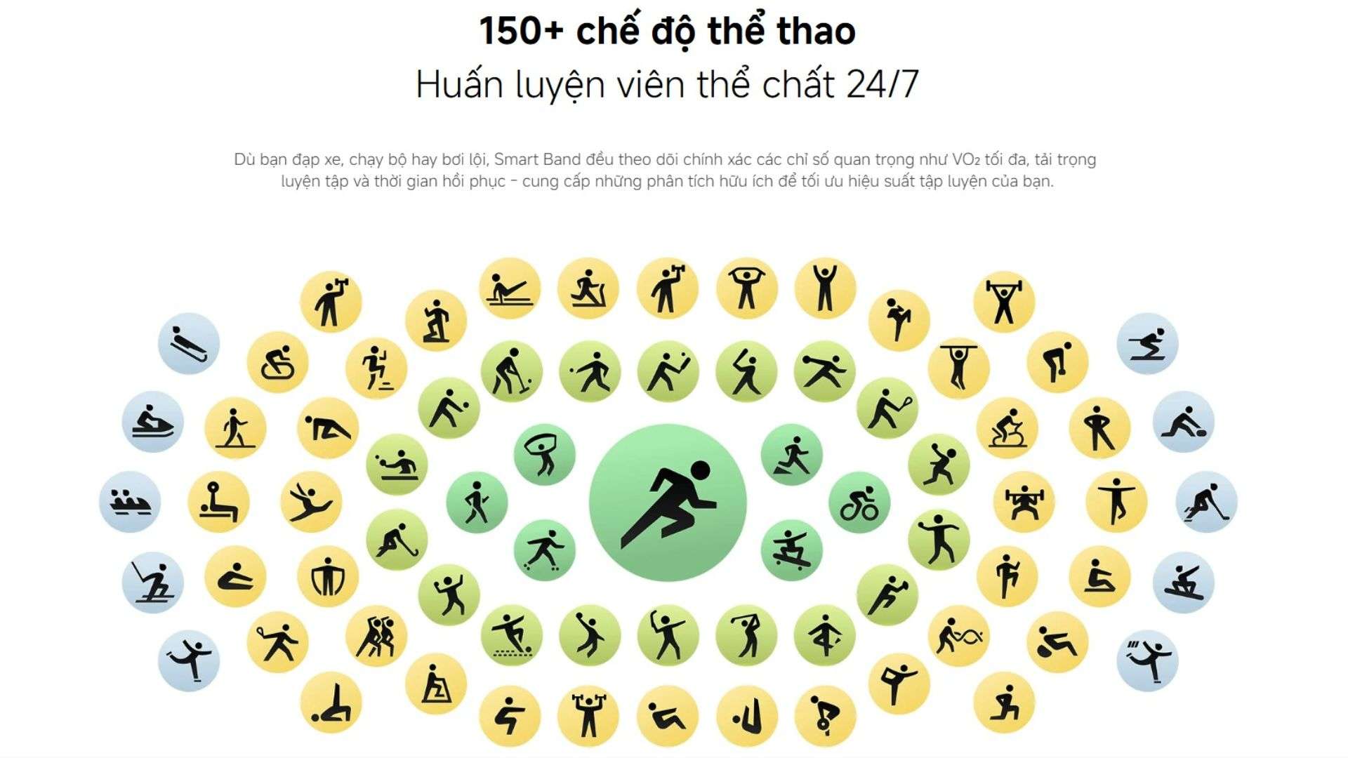Xiaomi Smart Band 10 không chỉ đẹp mà còn thông minh với hàng loạt tính năng theo dõi sức khỏe và thể thao chuyên nghiệp. Thiết bị hỗ trợ hơn 150 chế độ luyện tập, từ chạy bộ, đạp xe đến bơi lội. Đặc biệt, chế độ bơi lội nâng cao tích hợp cảm biến chín trục và công nghệ AI, cho phép nhận diện kiểu bơi với độ chính xác 96% và đo nhịp tim theo thời gian thực dưới nước. Chuẩn chống nước 5ATM đảm bảo hoạt động bền bỉ trong các hoạt động dưới nước.