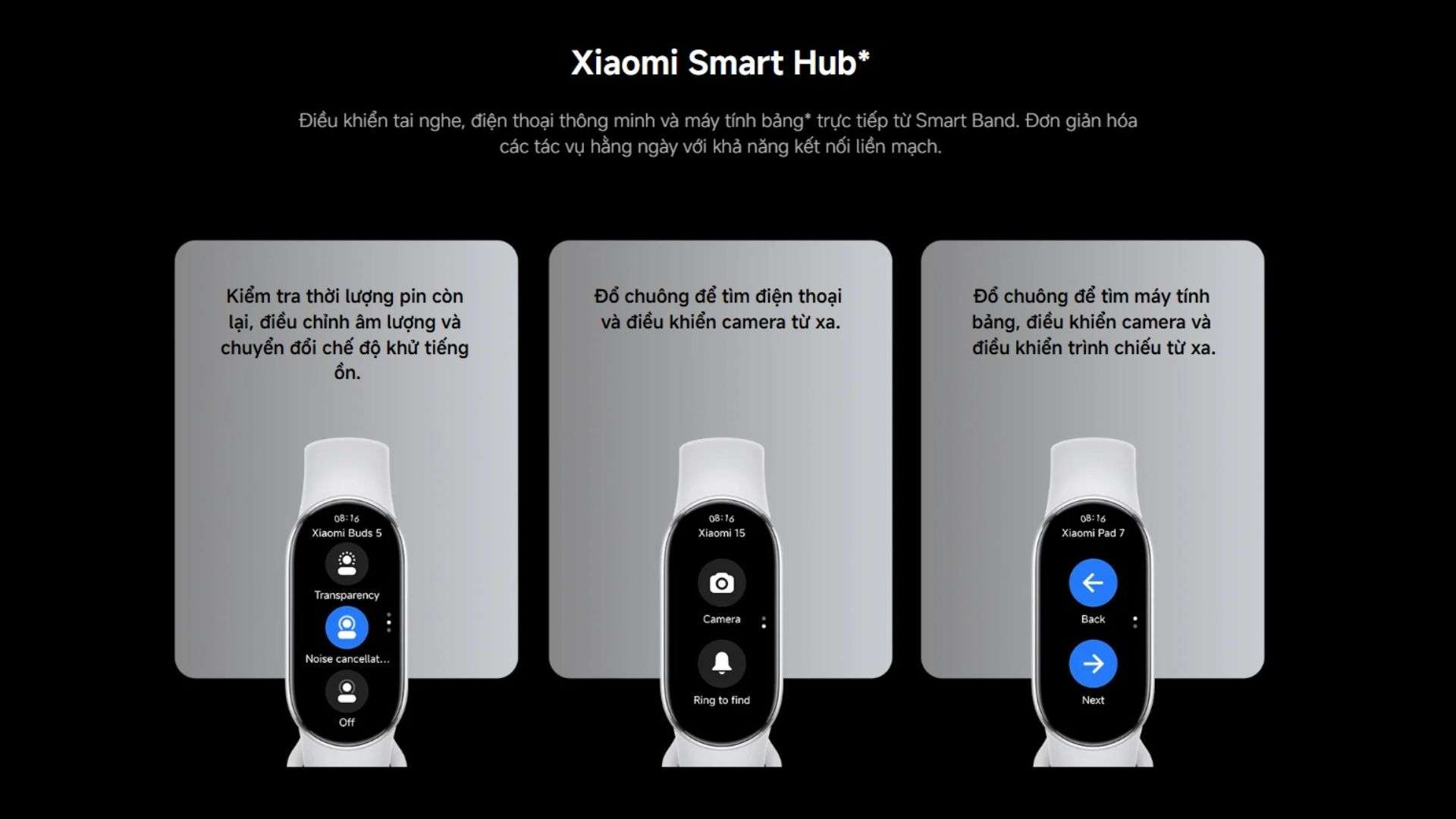 Chạy trên nền HyperOS 2, thiết bị mang đến khả năng kết nối mượt mà với các sản phẩm trong hệ sinh thái Xiaomi. Tính năng Xiaomi Smart Hub cho phép điều khiển tai nghe, điện thoại hoặc máy tính bảng trực tiếp từ vòng đeo tay. Người dùng có thể kiểm tra thời lượng pin, điều chỉnh âm lượng, chụp ảnh từ xa hoặc thậm chí tìm thiết bị bị thất lạc. Ngoài ra, vòng đeo tay hỗ trợ Bluetooth 5.4 và một số phiên bản tích hợp NFC cho thanh toán không tiếp xúc.