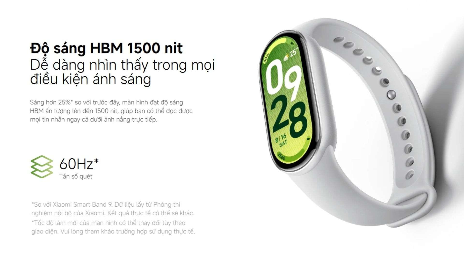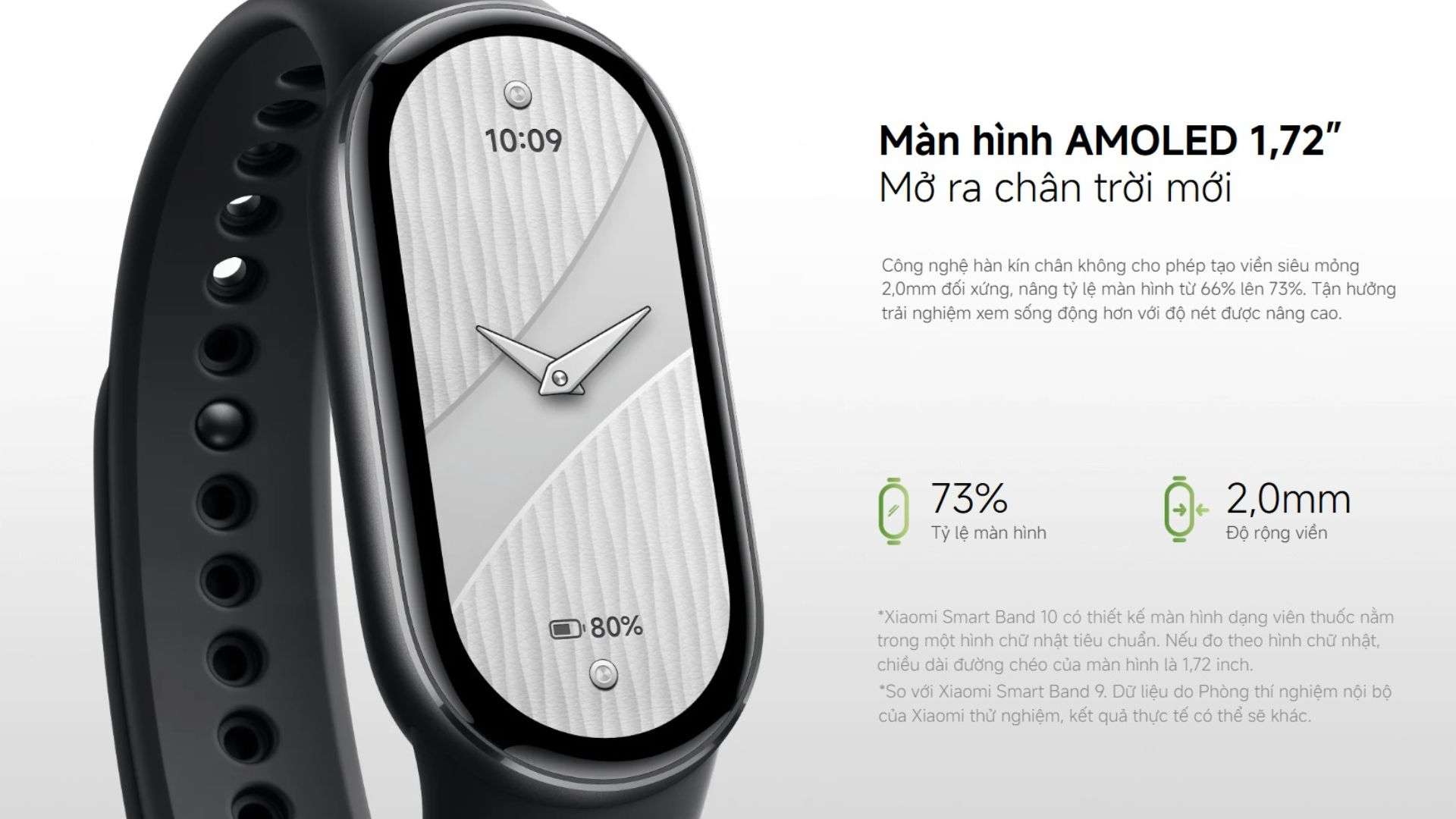 Xiaomi Smart Band 10 gây ấn tượng mạnh mẽ với thiết kế tinh tế, mang hơi hướng thời trang cao cấp. Điểm nhấn nổi bật là màn hình AMOLED 1,72 inch, lớn hơn so với thế hệ trước (1,62 inch), với viền siêu mỏng chỉ 2,0mm đối xứng. Tỷ lệ màn hình so với thân máy đạt 73%, mang đến trải nghiệm hình ảnh sống động và sắc nét. Độ sáng tối đa lên đến 1500 nit, kết hợp tần số quét 60Hz, giúp hiển thị rõ ràng ngay cả dưới ánh nắng gắt.