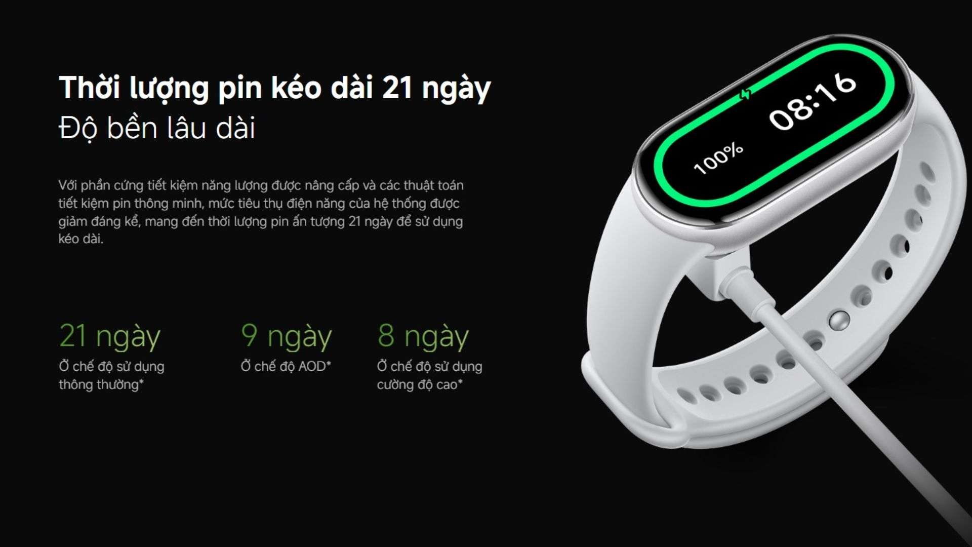 Xiaomi Smart Band 10 được trang bị pin có thời lượng lên đến 21 ngày ở chế độ sử dụng thông thường, 9 ngày với chế độ Always-On Display (AOD) và 8 ngày khi sử dụng cường độ cao. Thời gian sạc đầy chỉ khoảng 1 giờ, giúp người dùng luôn sẵn sàng.