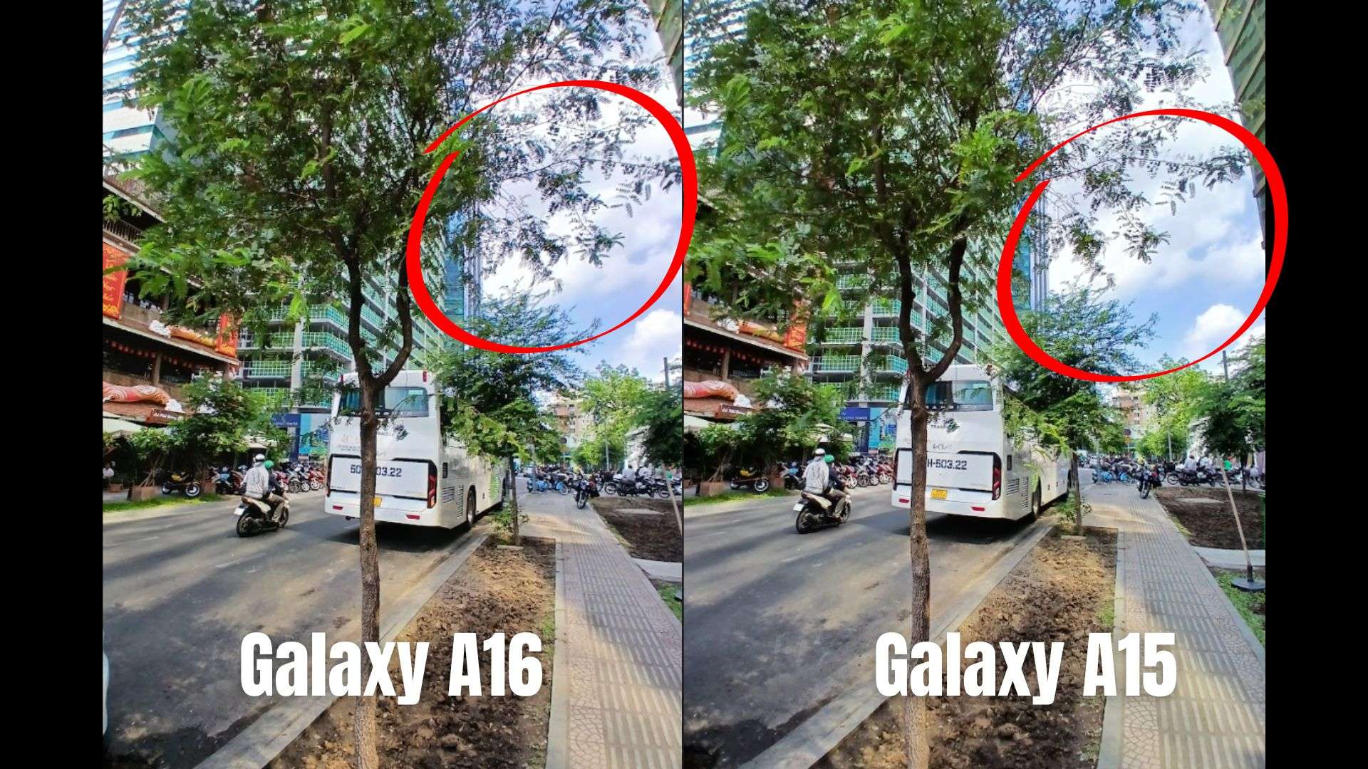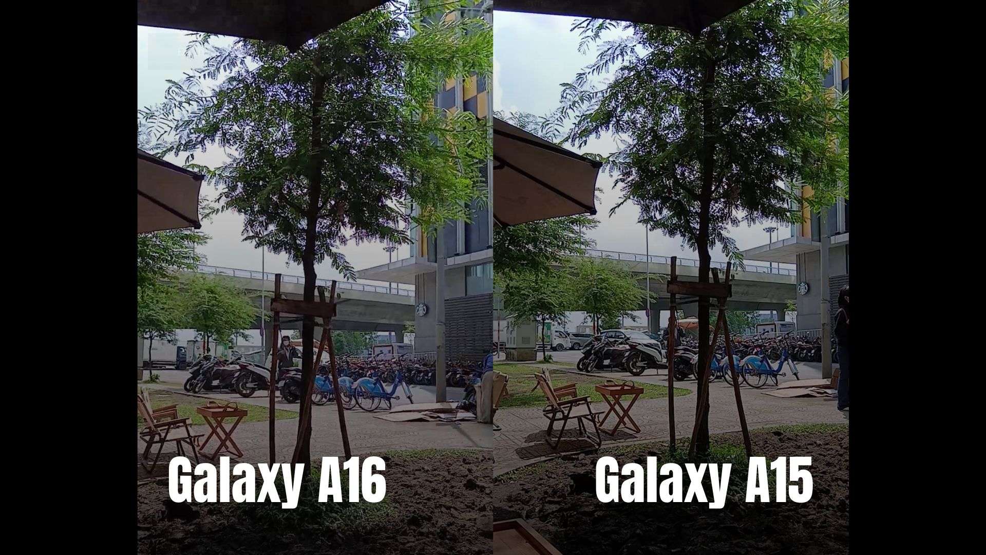 Nếu nhìn sơ qua về chất lượng và độ sắc nét cả hai đều khá tương đồng với nhau. Tuy nhiên ảnh chụp ban ngày từ Galaxy A16 cho màu sắc tươi tắn và độ sáng tổng thể tốt hơn một chút so với Galaxy A15. Các vùng lá cây trên A16 lên màu xanh mướt, còn A15 thì màu xanh hơi trầm hơn.
