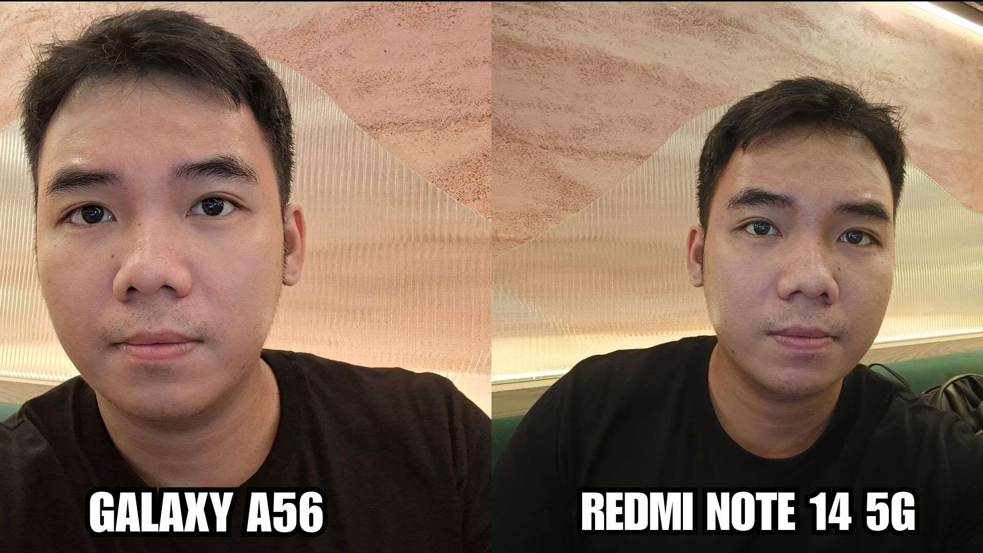Camera selfie của Galaxy A56 với độ phân giải 12MP mang lại hình ảnh sáng rõ, chi tiết khuôn mặt nổi bật ngay cả trong ánh sáng yếu. Camera selfie 8MP của Redmi Note 14 5G tuy sắc nét nhưng màu sắc có phần nhạt hơn, đặc biệt trong điều kiện thiếu sáng.