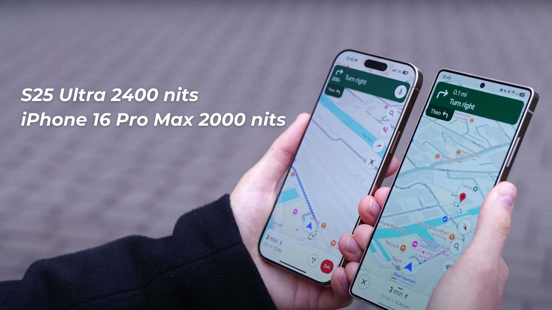 Khi so sánh về độ sáng giữa S25 Ultra và iPhone 16 Pro Max, có thể thấy màn hình của S25 Ultra (2400 nits) nhỉnh hơn một chút so với đối thủ. Mặc dù kém hơn, nhưng với độ sáng 2000 nits thì iPhone 16 Pro Max vẫn có thể hiển thị tốt dưới điều kiện ánh sáng mạnh như dưới ánh nắng mặt trời không thua kém gì flagship nhà Samsung.