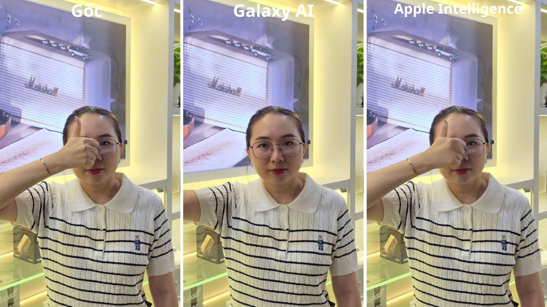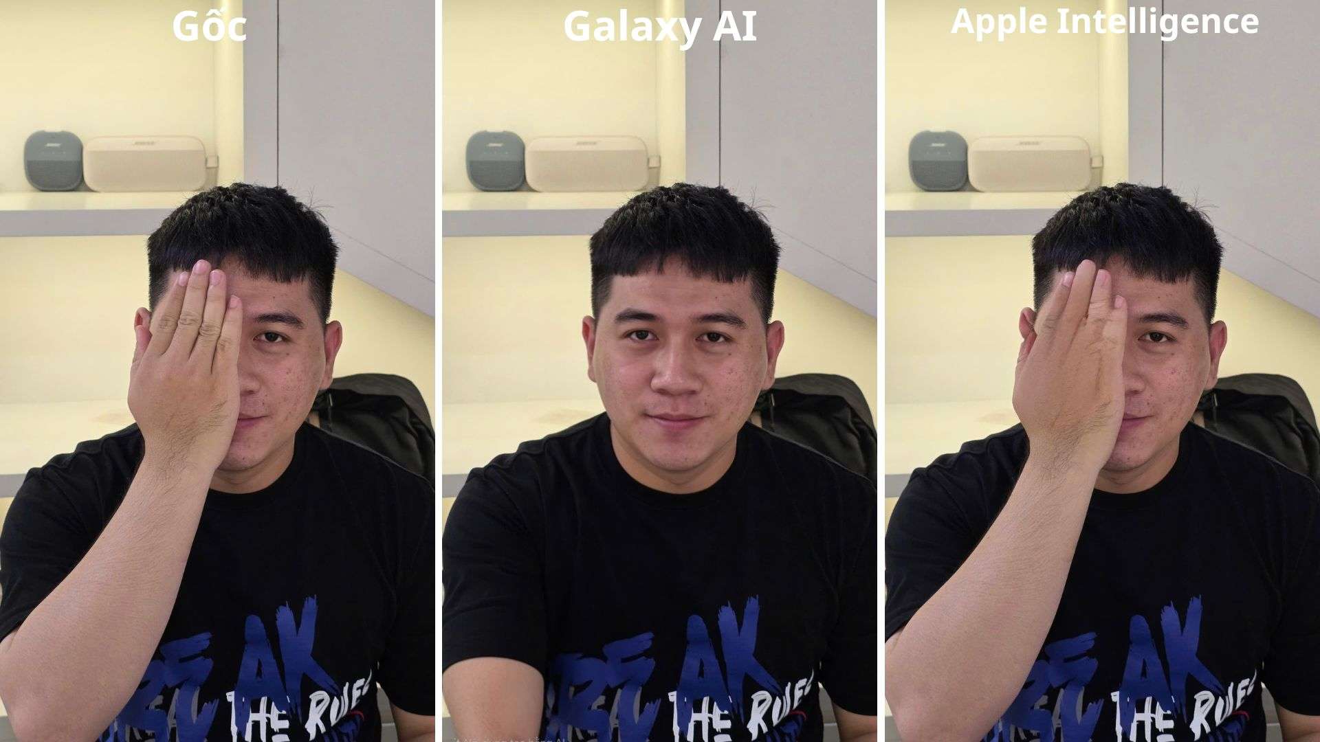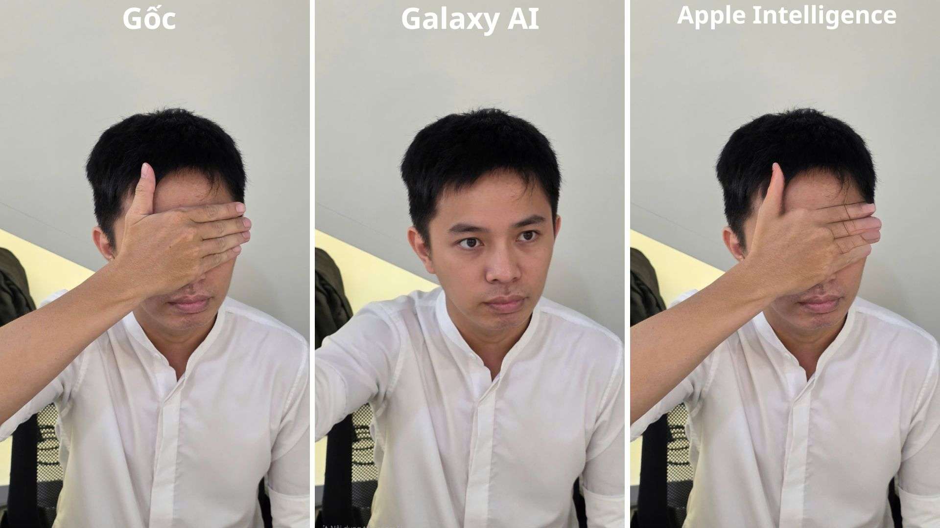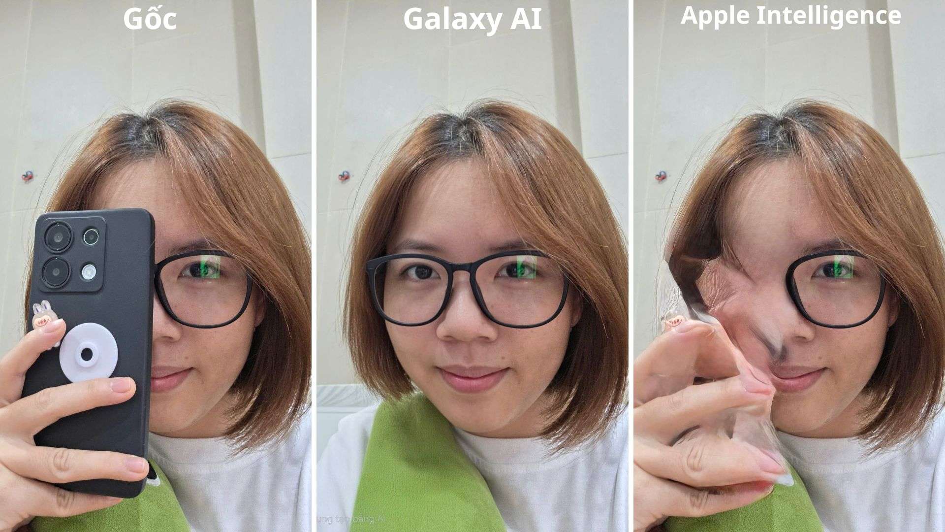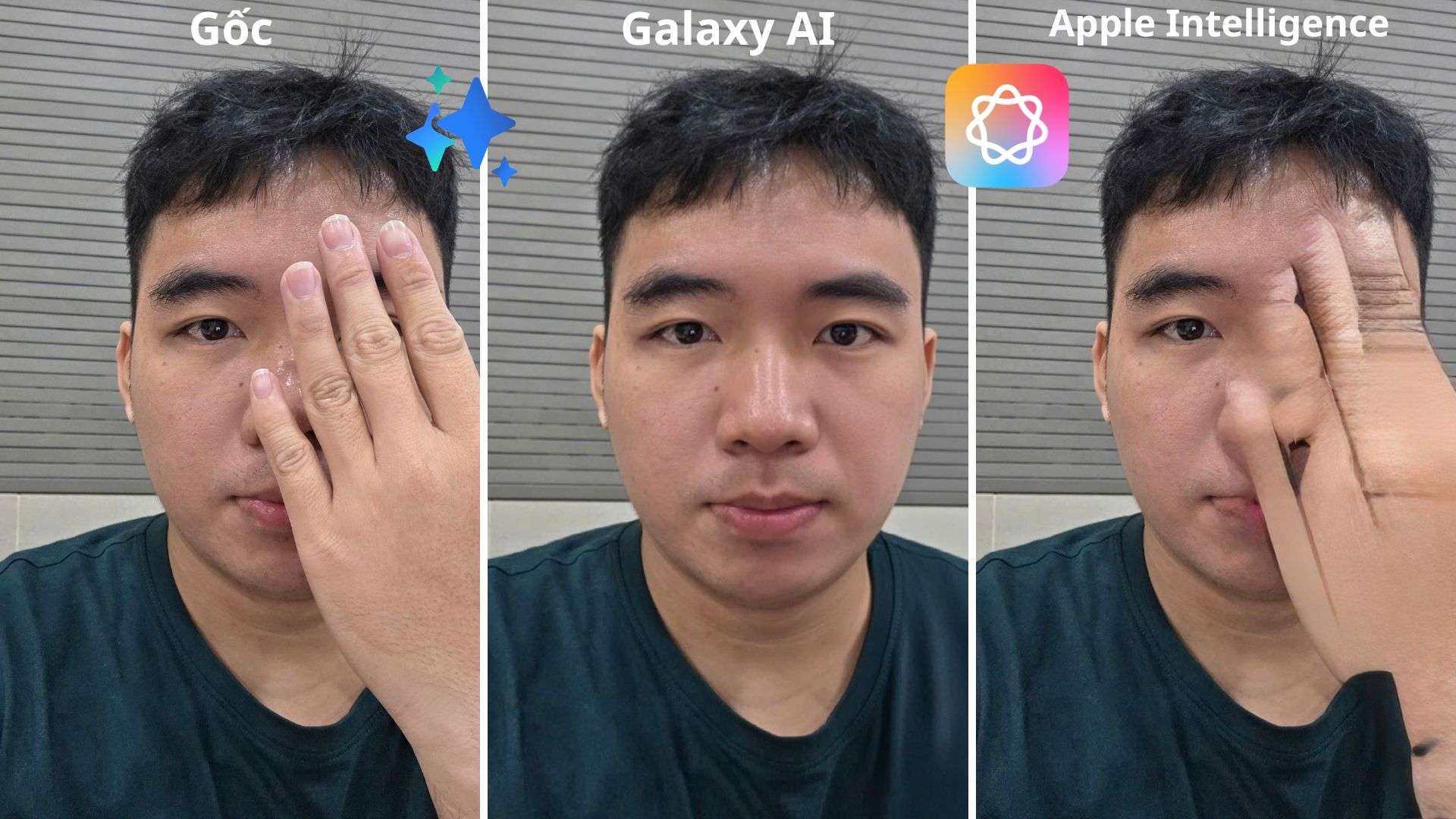 Ngược lại, Apple Intelligence gặp khó khăn lớn khi xử lý chi tiết này. Dù điện thoại đã bị xóa, nhưng bàn tay vẫn bị méo nặng, đồng thời vùng khuôn mặt được phục hồi có vệt nhòe và không trùng khớp với phần còn lại. Nhìn chung, Galaxy AI tiếp tục chiếm ưu thế khi xử lý tình huống này một cách chính xác hơn.