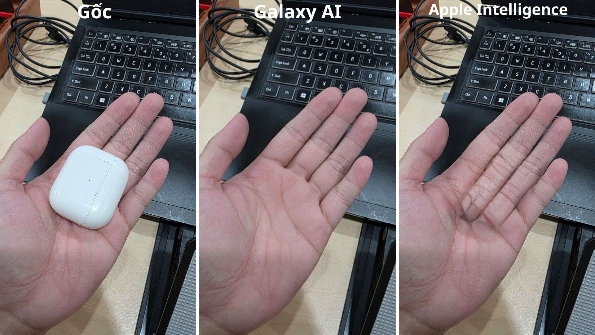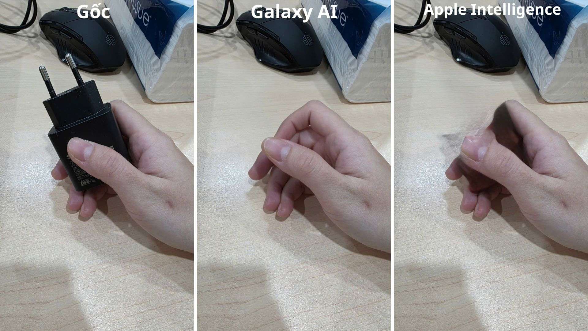 Trong khi đó, Apple Intelligence gặp phải lỗi tái tạo nền, khiến bàn tay bị nhòe nhẹ tại vị trí cầm củ sạc. Một số vệt bóng mờ vẫn còn lại, cho thấy AI chưa thực sự xóa vật thể một cách hoàn chỉnh. Kết luận, Galaxy AI tiếp tục chiến thắng trong thử nghiệm này.