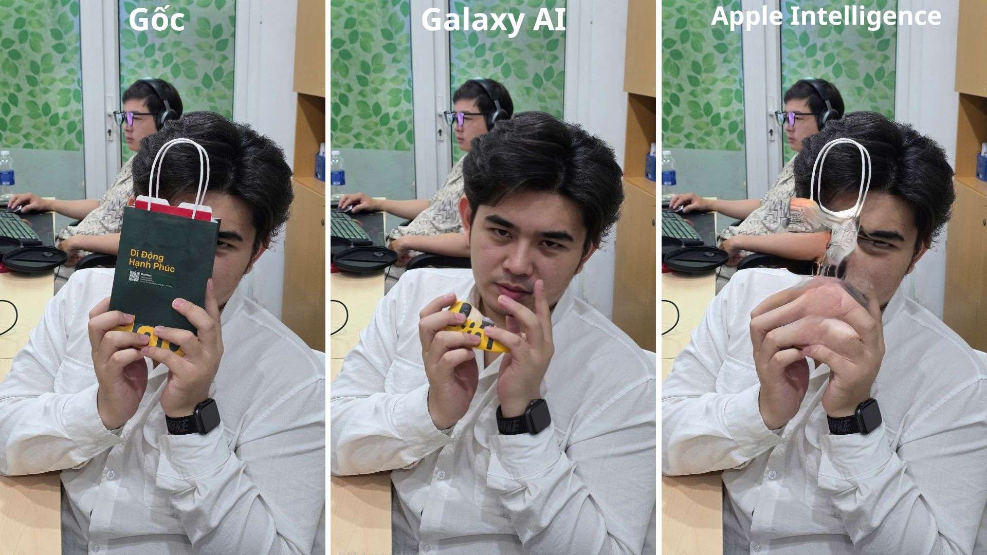 Trong khi đó, Apple Intelligence gặp lỗi nghiêm trọng khi xử lý ảnh này. Phần tay bị méo, đồng thời vẫn còn một số dấu vết của túi giấy bị xóa chưa hoàn chỉnh. Màu sắc trên khuôn mặt cũng bị xáo trộn, tạo cảm giác không đồng nhất. Nhìn chung, Galaxy AI tiếp tục thể hiện khả năng xử lý vượt trội hơn Apple Intelligence trong thử nghiệm này.
