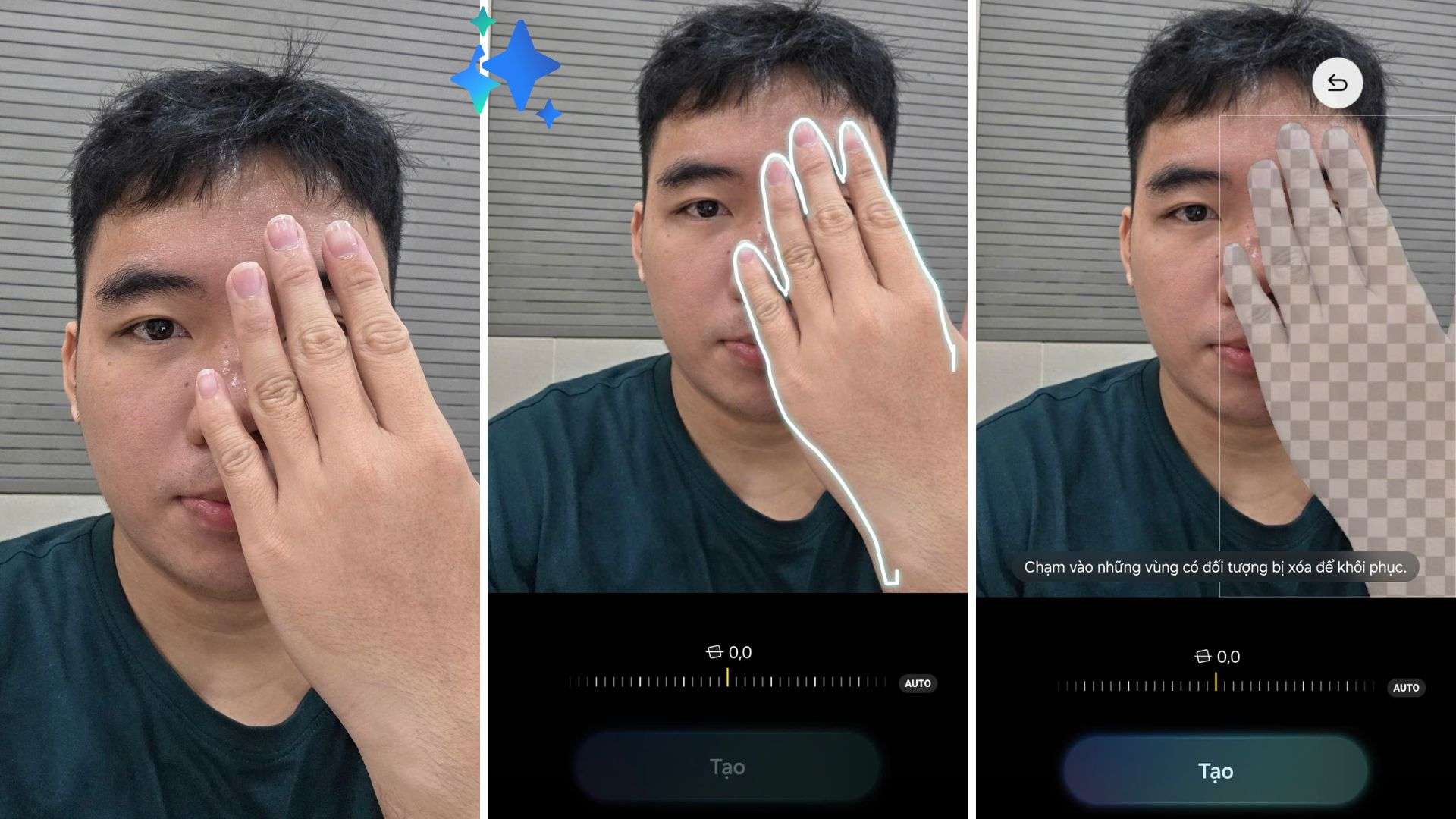 Khi sử dụng Galaxy AI, bàn tay đã được xóa hoàn toàn, phần khuôn mặt bị che được tái tạo rất tự nhiên mà không để lại dấu vết chỉnh sửa. Tông màu da vẫn đồng nhất, ánh sáng không bị ảnh hưởng và khuôn mặt giữ được đường nét nguyên bản.