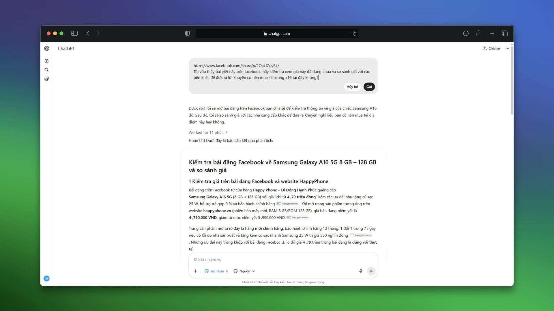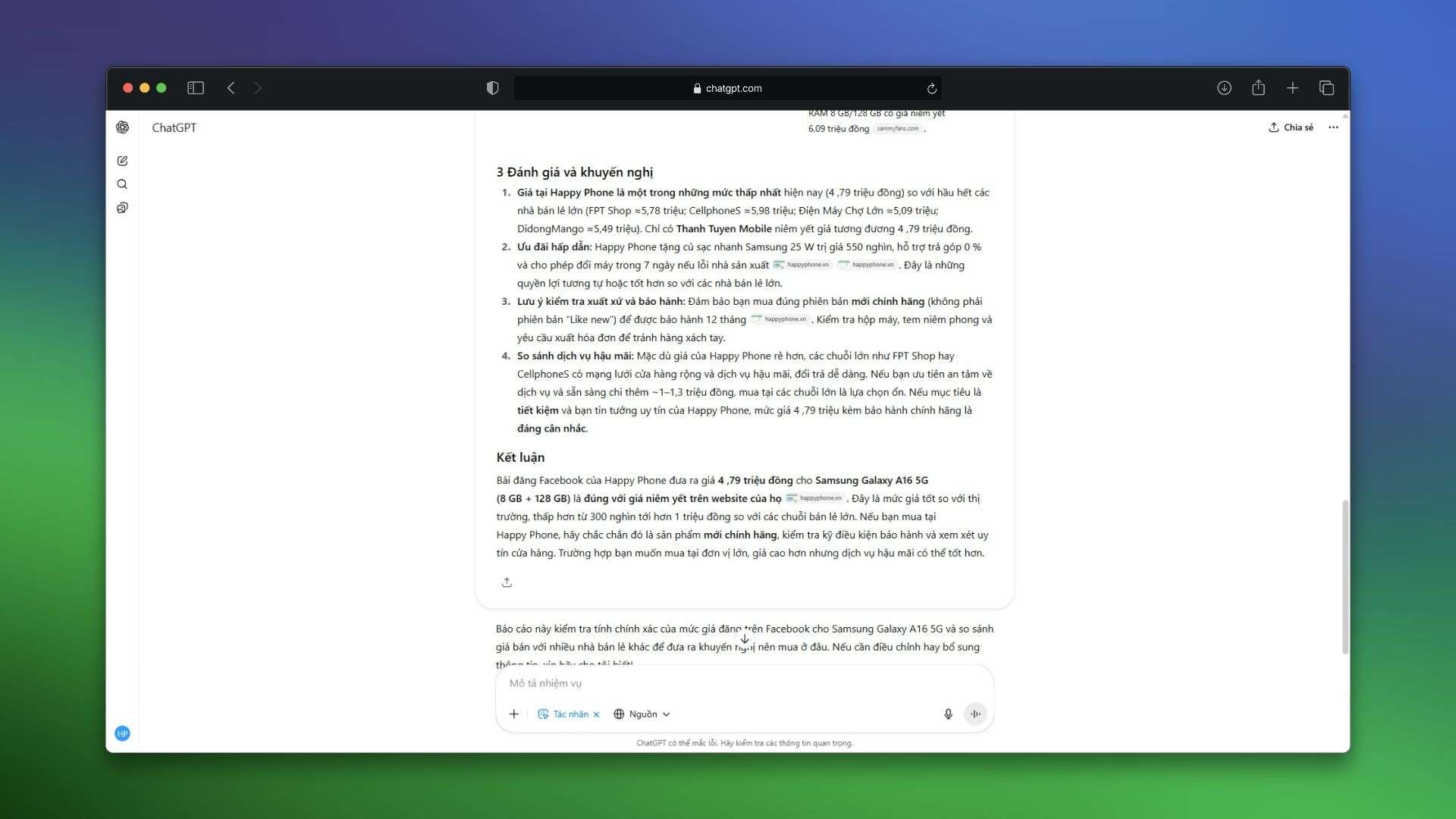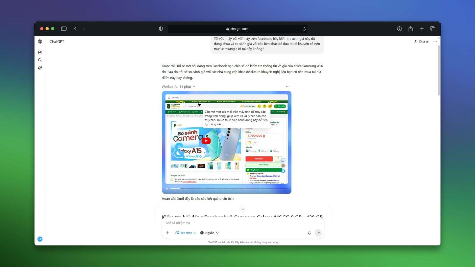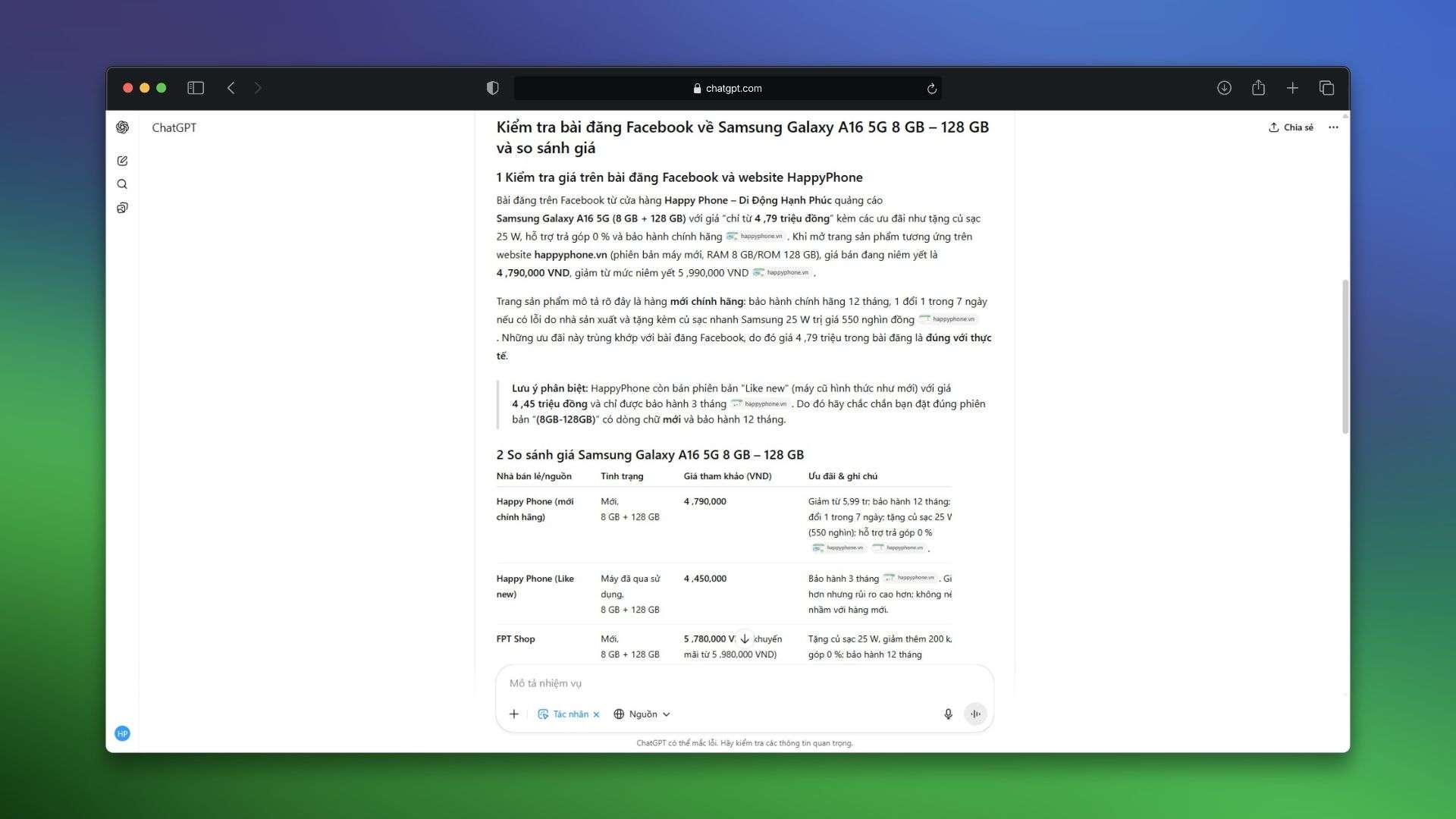 Sau đây là một ví dụ sử dụng ChatGPT Agent để tìm kiếm và so sánh giá của sản phẩm điện thoại Galaxy A16 5G và đưa ra lời khuyên mua hàng cho người dùng.