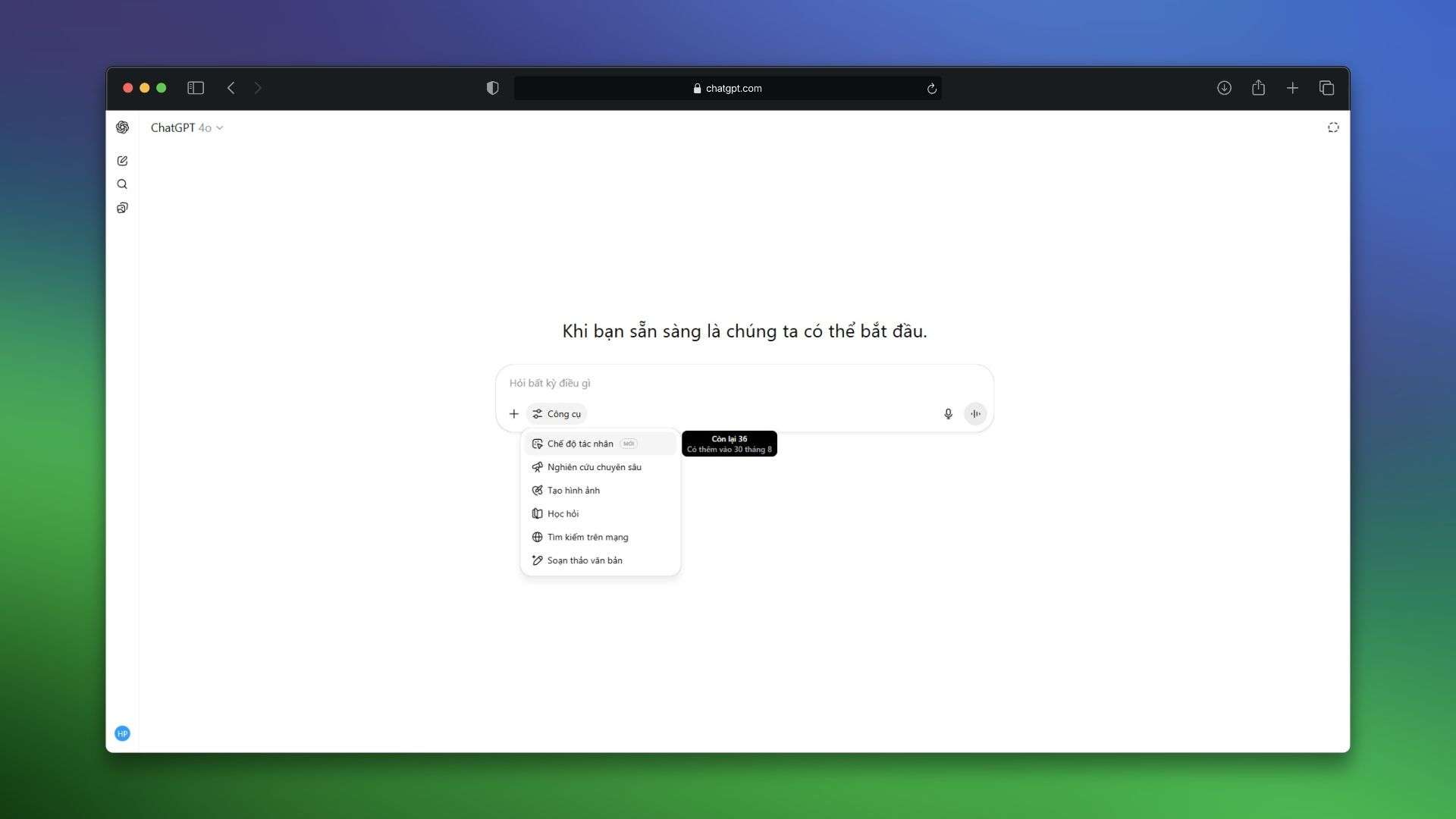 • Truy cập giao diện: Mở ChatGPT trên trình duyệt hoặc ứng dụng desktop/điện thoại. Đảm bảo bạn đã đăng nhập vào tài khoản có gói Plus, Pro, hoặc Team.