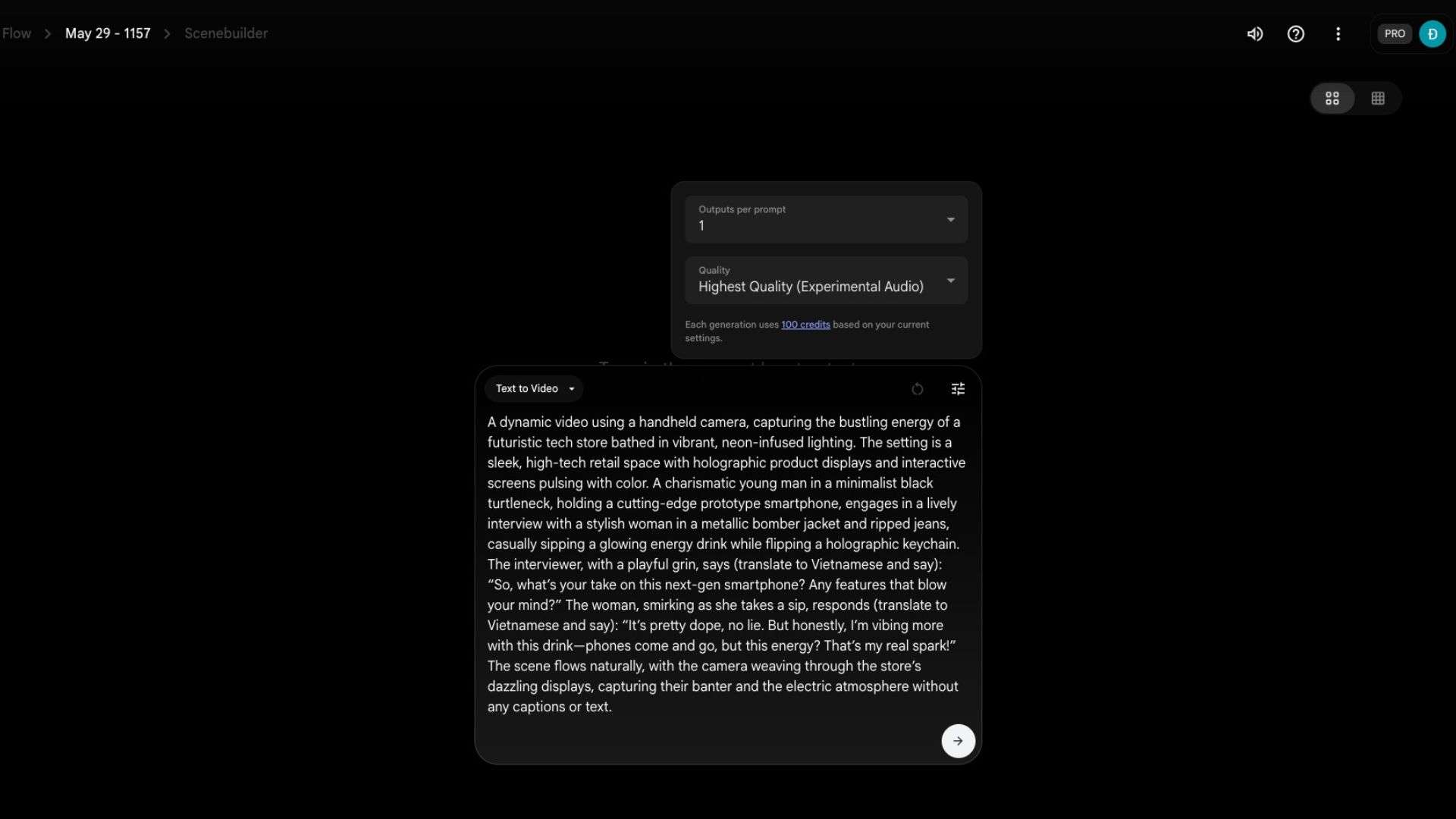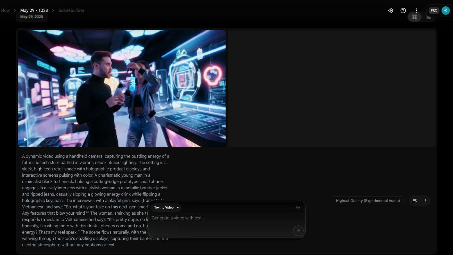 • Mô tả cảnh (SCENE DESCRIPTION): Miêu tả bối cảnh chi tiết, bao gồm không gian, nhân vật, hành động, và các yếu tố trực quan như màu sắc hoặc công nghệ (ví dụ: cửa hàng công nghệ tương lai với màn hình holographic).