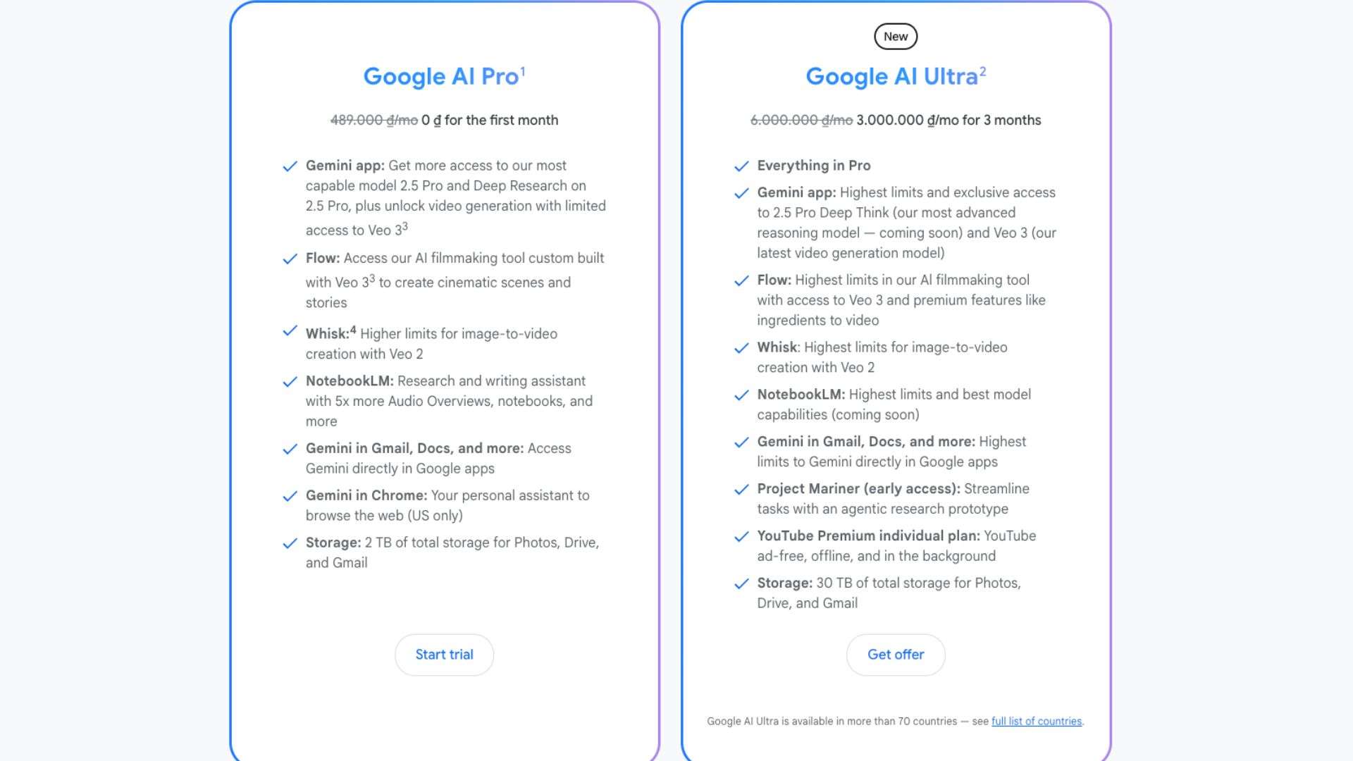 • Google AI Ultra: Giá khoảng 3 triệu VNĐ/3 tháng (giai đoạn thử nghiệm) hoặc 6 triệu VNĐ/tháng sau đó, cung cấp 12.500 tín dụng AI mỗi tháng. Gói này hiện chỉ khả dụng ở hơn 70 quốc gia, chưa bao gồm Việt Nam.