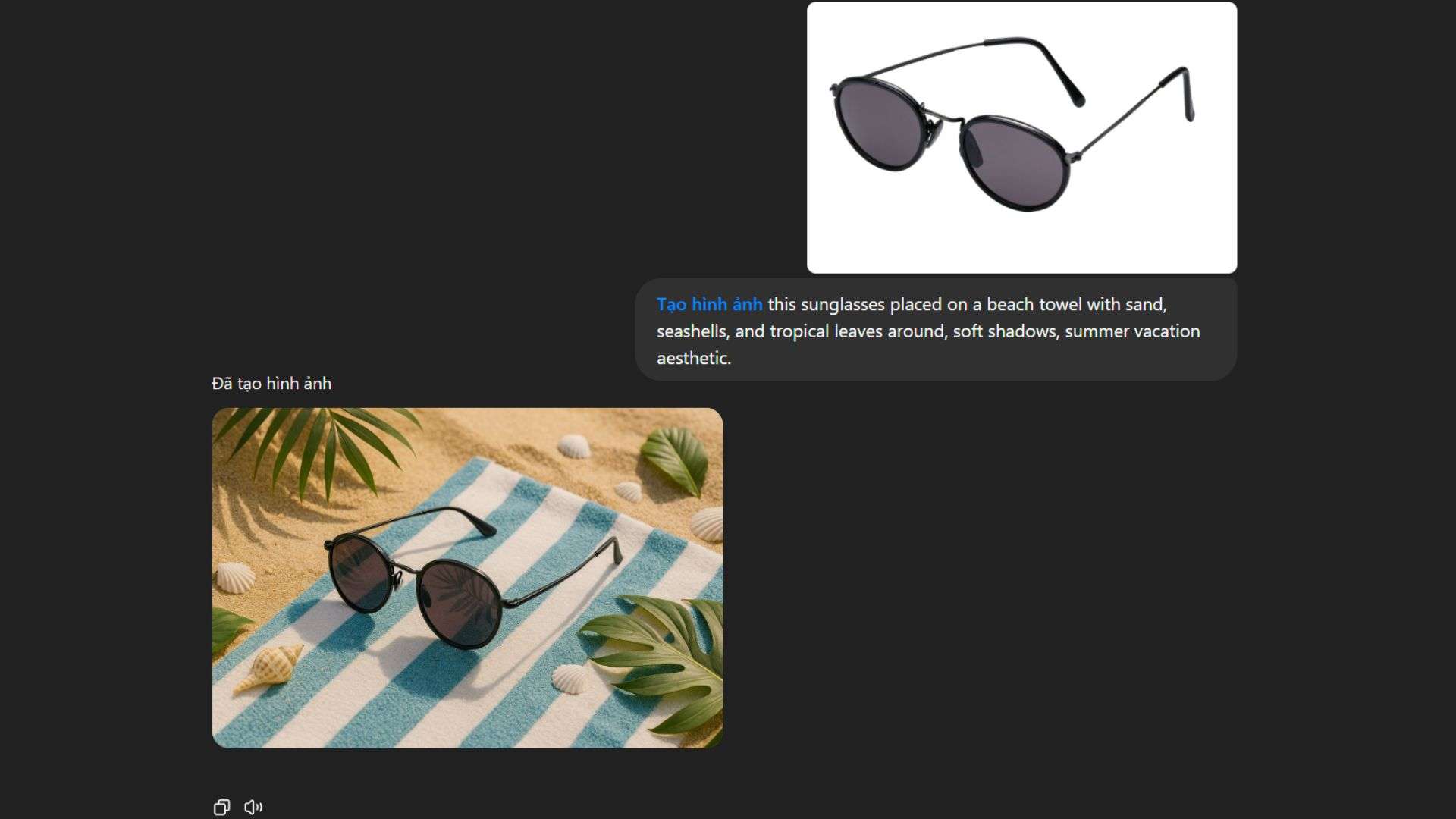 • Mô tả càng chi tiết càng tốt, bao gồm: chất liệu mắt kính (kim loại, nhựa trong suốt…), loại ánh sáng (tự nhiên, studio, ánh sáng vàng…), không gian nền (bãi biển, studio trắng, bối cảnh đô thị…) và cảm giác hình ảnh (sang trọng, thời trang, năng động…).